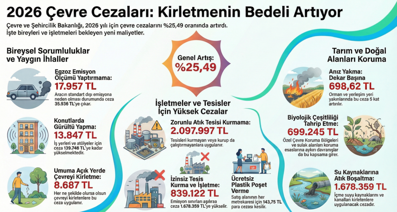 Çevre, Şehircilik ve İklim Değişikliği Bakanlığı, 2026 yılında çevreyi kirletenlere uygulanacak idari para cezalarını açıkladı. Çevre ve Şehircilik Bakanlığı tarafından hazırlanan Çevre Kanunu Uyarınca Verilecek İdari Para Cezalarına İlişkin Tebliğ, Resmi Gazete’de yayımladı. İlgili kanuna aykırı davranan kişi ve kuruluşlara 2026 yılında kesilecek para cezaları yeniden değerleme oranı olan %25,49 oranında artırıldı. Egzoz emisyonu ölçümü yaptırmama cezası Yeni yılla berabar egzoz gazı emisyon ölçümü yaptırmayanlar 17 bin 957 lira ceza ödeyecek. Aynı aracın yönetmeliklerle belirlenen standartlara aykırı emisyona sebep olması durumunda ise ceza 35 bin 936 lira olacak. Ayrıca aracı egzoz gazı emisyon kontrol sistemi olmadan kullanan motorlu taşıt sahibine de 17 bin 957 lira ceza uygulanacak. Egzoz Gazı Emisyon Yetki Belgesi bulunan ancak yetkilendirme sonrasında yönetmelikle düzenlenen şartları kaybettiği tespit edildiği halde ölçüme devam eden veya tekniğine ve belirlenen kurallara aykırı ölçümler yapanlara da 71 bin 879 lira ceza verilecek. Hava kirliliği etkileri nedeniyle kurulması ve işletilmesi izne tabi tutulan tesisleri, yetkili makamlardan izin almadan kuran ve işleten, iznin iptal edilmesine rağmen kurmaya ve işletmeye devam eden, bu tesislerde izin almaksızın sonradan değişiklik yapan veya yetkili makamların gerekli gördükleri değişiklikleri tanınan sürede yapmayanlar 839 bin 122 lira ceza ödeyecek. Öte yandan bu tesislerde emisyon miktarları yönetmelikle belirlenen sınırları aşıyorsa, ödenecek idari para cezası 1 milyon 678 bin 359 lira olacak. Benzin ve naftanın depolanması, dolumu ve tankerlerle nakliyesine ilişkin terminaller, dolum adaları veya akaryakıt istasyonlarında kullanılan her türlü düzenek, tesis ile tankerlerden salınan uçucu organik bileşiklerin kontrolüne ilişkin Bakanlıkça belirlenen esas ve kriterlere uymayanlara idari para cezası uygulanacak. Bu kapsamda, terminaller veya dolum adaları için 521 bin 404, akaryakıt istasyonları için 260 bin 701, tankerler için 26 bin 65 lira idari ceza uygulanacak. Katı yakıt özelliklerini sağlamayan maddeleri ithal eden veya satanlara, katı yakıtların depolanması, taşınması, yüklenmesi, boşaltılması veya torbalanmasına ilişkin düzenlemelere uymayanlara 143 bin 791 lira ceza kesilecek. Belgelerin veya izinlerin alınmaması durumunda ise ceza 215 bin 693 lira olacak. Atıkları önlem almadan toprağa vermenin cezası Kanun ve yönetmelikte öngörülen standartlara aykırı şekilde veya önlemleri almadan atıkları toprağa verenlere 839 bin 122, bu fiilin konutlarla ilgili işlenmesi halinde her konut ve bağımsız bölüm için 20 bin 842 lira ceza verilecek. Bu cezai sorumluluk, müstakil konutlarda konutu kullanana, diğer konutlarda ise yöneticiye ait olacak. Anız yakma cezası Biyolojik çeşitliliği tahrip edenlere, ilan edilen Özel Çevre Koruma Bölgeleri için tespit edilen koruma ve kullanma esaslarına aykırı davrananlara ve sulak alanlar için yönetmelikle belirlenen koruma ve kullanım usul ve esaslarına aykırı davrananlara 699 bin 245 lira cezai işlem yapılacak. Kanuna aykırı olarak anız yakanlar, her dekar için 698,62 lira ödeyecek. Anız yakma fiilinin orman ve sulak alanlara bitişik yerler ile meskun mahallerde işlenmesi durumunda ceza 5 kat artırılacak. Kanundaki koruma esaslarına aykırı olarak içme ve kullanma suyu koruma alanlarına, kaynağın kendisine ve bu kaynağı besleyen yer üstü ve yer altı sularına, sulama ve drenaj kanallarına atık boşaltanlara 1 milyon 678 bin 359 lira idari ceza kesilecek. Bu fiilin konutlarla ilgili olarak işlenmesi halinde her konut ve bağımsız bölüm için ceza miktarı 41 bin 820 lira olacak. Mevzuatlardaki usul ve esaslara, yasaklara veya sınırlamalara aykırı atık toplayan, taşıyan, geçici ve ara depolama yapan, geri kazanan, geri dönüşüm sağlayan, tekrar kullanan veya bertaraf edenlere 782 bin 106 liradan 3 milyon 128 bin 439 liraya kadar ceza verilecek, ithal edenler ise 2 milyon 607 bin 30 lira ödeyecek. Umuma açık yerlerde çevreyi kirletmenin cezası Umuma açık yerlerde her ne şekilde olursa olsun çevreyi kirletenlerin cezası 8 bin 687 lira olarak belirlendi. Düzenlemeyle tehlikeli atıkların ülkeye girişini sağlayanlara, kanuna aykırı şekilde toplayanlara, depolayanlara, ihraç edenlere yönelik ceza miktarları da artırıldı. Usul ve esaslara aykırı plastik poşet verme cezası Plastik poşetleri ilgili mevzuata aykırı olarak ücretsiz veya Bakanlıkça belirlenen usul ve esaslara aykırı verdiği tespit edilen satış noktalarına depo alanı hariç kapalı satış alanının her metrekaresi için 143,75 lira, elektronik ortamda satış yapanlara ise 26 bin 65 liradan 260 bin 701 liraya kadar ceza uygulanacak. Ayrıca Bakanlıkça belirlenen usul ve esaslara aykırı plastik poşetleri üretene, tedarik edene, üreticinin Türkiye dışında olması halinde, üretici tarafından yetkilendirilen temsilciye ve/veya ithalatçıya 130 bin 348, geri kazanım katılım payına ilişkin belirlenen esaslara uymayanlara da 13 bin 032 lira cezai işlem yapılacak. [news_id:796800]