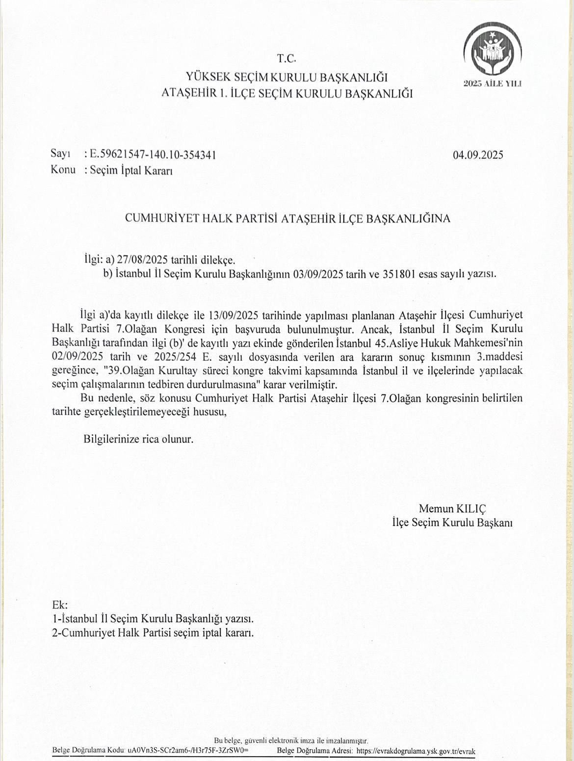 İstanbul Ataşehir İlçe Seçim Kurulu, CHP İstanbul İl Yönetimi'ne kayyım atanması gerekçe göstererek, CHP'nin Ataşehir ilçe kongresini engelleme kararı aldı. İstanbul 45. Asliye Hukuk Mahkemesi, İstanbul İl Örgütü'nün 5 Kasım 2025'te gerçekleştirilecek CHP'nin 39. Olağan Kongresi için il ve ilçe kongresi seçim çalışmalarının tedbiren durdurulmasına karar vermişti. Mahkeme 196 delegenin tedbiren görevden uzaklaştırılmalarına karar verilirken mevcutta yürüyen kongre sürecinin de durdurulmasına hükmetmişti. CHP Ataşehir İlçe Seçimleri de bu durdurma kararı kapsamında iptal edildi.