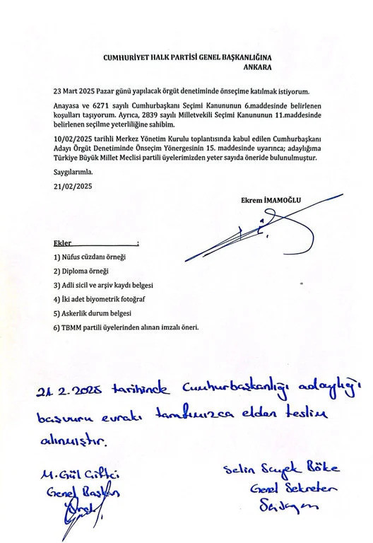 İBB Başkanı Ekrem İmamoğlu, CHP’nin bir sonraki seçimde göstereceği cumhurbaşkanı adayını belirlemek üzere düzenlenecek ön seçime girmek için başvurusunu yaptı. CHP'de 23 Mart'ta cumhurbaşkanı adaylığı için yapılacak ön seçim için hazırlıklar sürerken aday adaylığı için imza verme süreci salı günü başlamıştı. Adaylık için cuma gününü işaret eden İBB Başkanı Ekrem İmamoğlu ise cumhurbaşkanı adaylığı için ön seçim başvurusunu yaptı. BirGün'de yer alan habere göre başvuru, İmamoğlu’nun avukatı Mehmet Pehlivan tarafından yapıldı. Pehlivan, İBB Başkanı İmamoğlu’nın aday başvuru belgelerini, CHP Seçim ve Parti İçi Hukuk İşlerinden Sorumlu Genel Başkan Yardımcısı Gül Çiftçi’ye sundu. Pehlivan’a başvuru sırasında, CHP İstanbul Milletvekili Turan Taşkın Özer de eşlik etti.