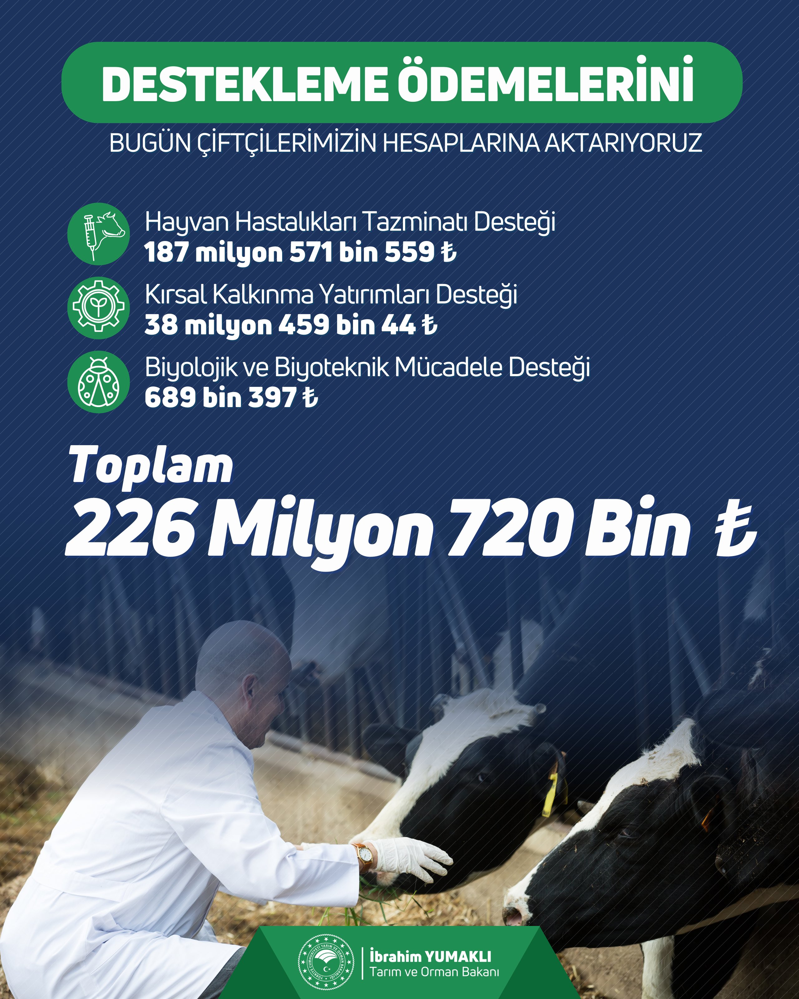 Tarım ve Orman Bakanı İbrahim Yumaklı, üreticilere yönelik toplamda 226 milyon 720 bin liralık tarımsal destekleme ödemesinin bugün itibarıyla çiftçilerin banka hesaplarına geçeceğini duyurdu. Bakan Yumaklı, sosyal medya hesabı üzerinden yaptığı açıklamada, tarımsal destekleme ödemelerinin detaylarına ve aktarım süreçlerine dair güncel bilgileri paylaştı. Üreticilerin alın terini ve harcadığı emeği koruma altına aldıklarını, tarımsal üretimin gücünü ise bu tür maddi desteklerle daha da büyütmeye kararlılıkla devam ettiklerini dile getiren Yumaklı, "226 milyon lira tarımsal destek ödemesi, bugün çiftçilerimizin hesaplarına aktarılıyor. Hayırlı ve bereketli olsun." dedi. Destek ödemelerinin alt kalemleri ve detayları Yapılan resmi paylaşımda yer alan ayrıntılı verilere göre, hayvan hastalıkları tazminatı kapsamında yetiştiricilere 187 milyon 571 bin 559 lira tutarında bir ödeme sağlanırken, kırsal kalkınma yatırımlarının teşvik edilmesi amacıyla 38 milyon 459 bin 44 liralık bir kaynak ayrıldı. Ayrıca tarımsal üretimde zararlılarla mücadeleyi kapsayan biyolojik ve biyoteknik mücadele çalışmaları için de 689 bin 397 liralık destekleme ödemesi yapılacağı belirtildi.