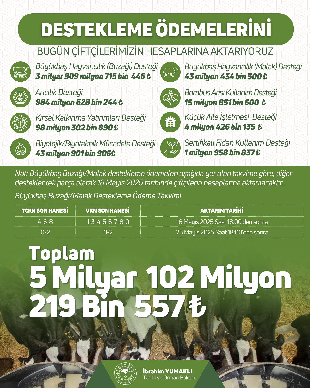 Tarım ve Orman Bakanı İbrahim Yumaklı, 5 milyar 102 milyon 219 bin lira destekleme ödemesinin, bugün çiftçilerin hesaplarına aktarılacağını bildirdi. Yumaklı, sosyal medya hesabından destekleme ödemelerine ilişkin paylaşımda bulundu. Alın teriyle toprağı yoğuran çiftçinin her zaman yanında olduklarını belirten Yumaklı, "5 milyar 102 milyon 219 bin lira destekleme ödemesini bugün çiftçilerimizin hesaplarına aktarıyoruz. Hayırlı ve bereketli olsun." ifadelerini kullandı. Paylaşımda yer alan bilgilere göre, büyükbaş hayvancılık (buzağı) desteği 3 milyar 909 milyon 715 bin 445 lira, büyükbaş hayvancılık (malak) desteği 43 milyon 434 bin 500 lira, arıcılık desteği 984 milyon 628 bin 244 lira, bombus arısı kullanım desteği 15 milyon 851 bin 600 lira, kırsal kalkınma yatırımları desteği 98 milyon 302 bin 890 lira, küçük aile işletmesi desteği 4 milyon 426 bin 135 lira, biyolojik/biyoteknik mücadele desteği 43 milyon 901 bin 906 lira, sertifika fidan kullanım desteği 1 milyon 958 bin 837 lira olarak belirlendi. Büyükbaş buzağı/malak destekleme ödemeleri, kimlik numarasının son hanesi "4-6-8", vergi numarasının son hanesi "1-3-4-5-6-7-8-9" olanlara bugün saat 18.00'den sonra yapılacak. Ödemeler, kimlik ve vergi numarasının son hanesi "0-2" olanlara da 23 Mayıs saat 18.00'den sonra gerçekleştirilecek. Kaynak: İbrahim Yumaklı - X
