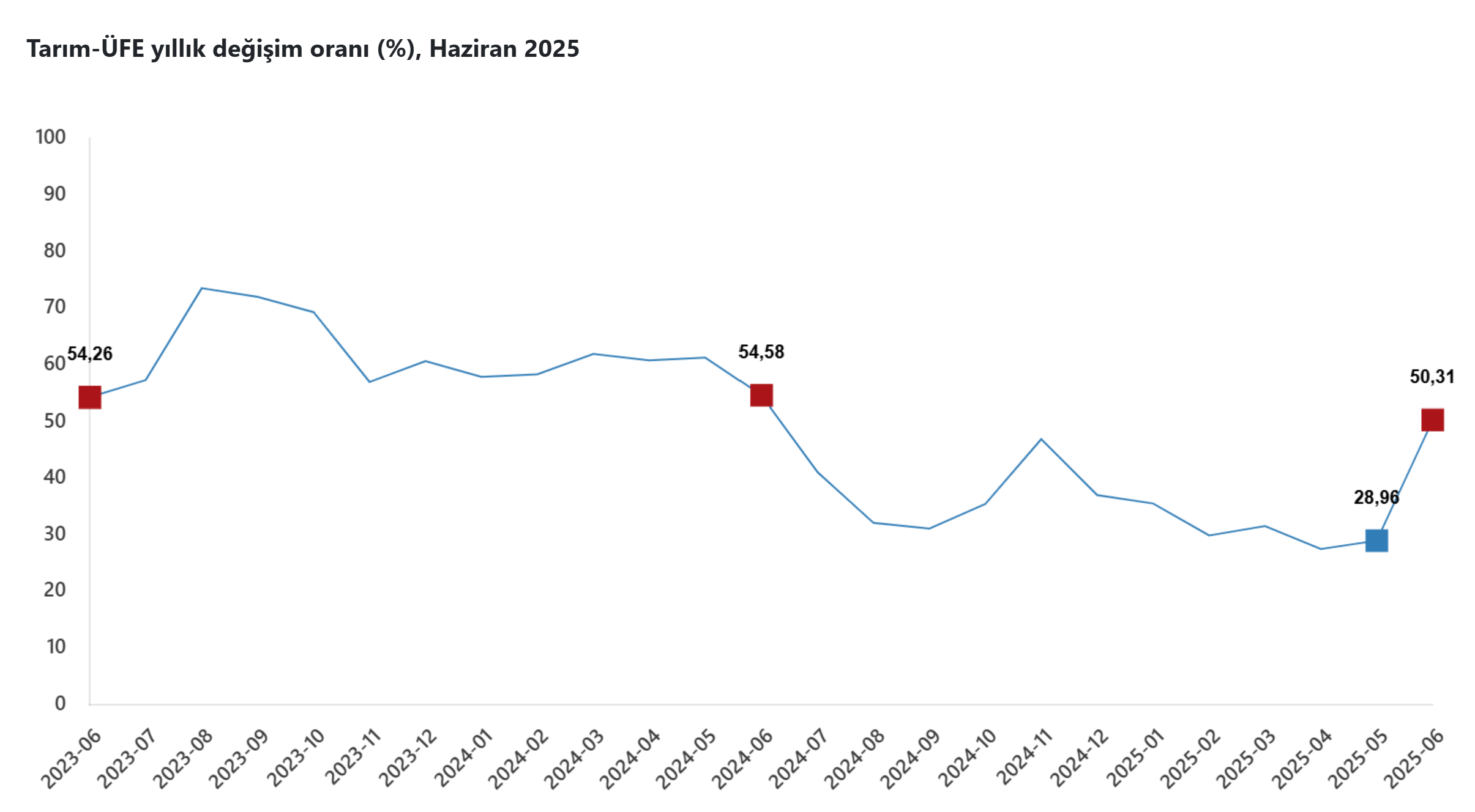 Tarım Ürünleri Üretici Fiyat Endeksi (Tarım ÜFE), haziranda bir önceki aya göre yüzde 18,82, geçen yılın aynı ayına kıyasla yüzde 50,31 artış gösterdi. Türkiye İstatistik Kurumu (TÜİK), haziran ayına ilişkin Tarım ÜFE verilerini açıkladı. Buna göre endeks, haziranda bir önceki aya kıyasla yüzde 18,82, geçen yılın aralık ayına göre yüzde 33,74, geçen yılın aynı ayına oranla yüzde 50,31 ve 12 aylık ortalamalara kıyasla yüzde 35,46 yükseldi. Kaynak: TÜİK Sektörlerde bir önceki aya göre değişime bakıldığında, tarım ve avcılık ürünleri ve ilgili hizmetlerde yüzde 19,98, ormancılık ürünleri ve ilgili hizmetlerde yüzde 0,5, balık ve diğer balıkçılık ürünleri, su ürünleri, balıkçılık için destekleyici hizmetlerde yüzde 5,25 artış gerçekleşti. Ana gruplarda bir önceki aya göre tek yıllık (uzun ömürlü olmayan) bitkisel ürünlerde yüzde 0,22, çok yıllık (uzun ömürlü) bitkisel ürünlerde yüzde 51,08 artış yaşanırken, canlı hayvanlar ve hayvansal ürünlerde yüzde 0,19 azalış kayıtlara geçti. Yıllık değişimin en yüksek gerçekleştiği alt grup yüzde 202,59 artışla yumuşak çekirdekli ve sert çekirdekli meyveler oldu. Aylık değişimin en yüksek olduğu alt grup da yüzde 47,92 artışla yumuşak çekirdekli ve sert çekirdekli meyveler olarak kaydedildi.
