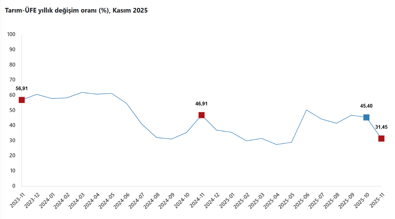 Tarım Ürünleri Üretici Fiyat Endeksi (Tarım ÜFE), kasımda bir önceki aya göre yüzde 1,56 azalırken, geçen yılın aynı ayına kıyasla yüzde 31,45 artış gösterdi. Türkiye İstatistik Kurumu, kasım ayına ilişkin Tarım ÜFE verilerini açıkladı. Endeks, kasımda bir önceki aya kıyasla yüzde 1,56 düşerken, geçen yılın aralık ayına göre yüzde 31,97, geçen yılın aynı ayına oranla yüzde 31,45 ve 12 aylık ortalamalara kıyasla yüzde 37,58 yükseldi. Kaynak: TÜİK Sektörlerde bir önceki aya göre değişime bakıldığında, tarım ve avcılık ürünleri ve ilgili hizmetlerde yüzde 1,75 azalış görülürken, orman ürünleri ile ilgili hizmetlerde yüzde 1,66, balık ve diğer balıkçılık ürünleri, su ürünleri, balıkçılık için destekleyici hizmetlerde yüzde 1,07 artış gerçekleşti. Ana gruplarda bir önceki aya göre, tek yıllık (uzun ömürlü olmayan) bitkisel ürünlerde yüzde 0,69, çok yıllık (uzun ömürlü) bitkisel ürünlerde yüzde 0,03 azalış, canlı hayvanlar ve hayvansal ürünlerde yüzde 2,17 artış kayıtlara geçti. Yıllık değişimin en yüksek olduğu alt grup, yüzde 122,79 artışla yumuşak çekirdekli ve sert çekirdekli meyveler oldu. Aylık değişimin en yüksek olduğu alt grup da yüzde 38,02 azalışla tropikal ve subtropikal meyveler olarak kaydedildi. [news_id:788996]