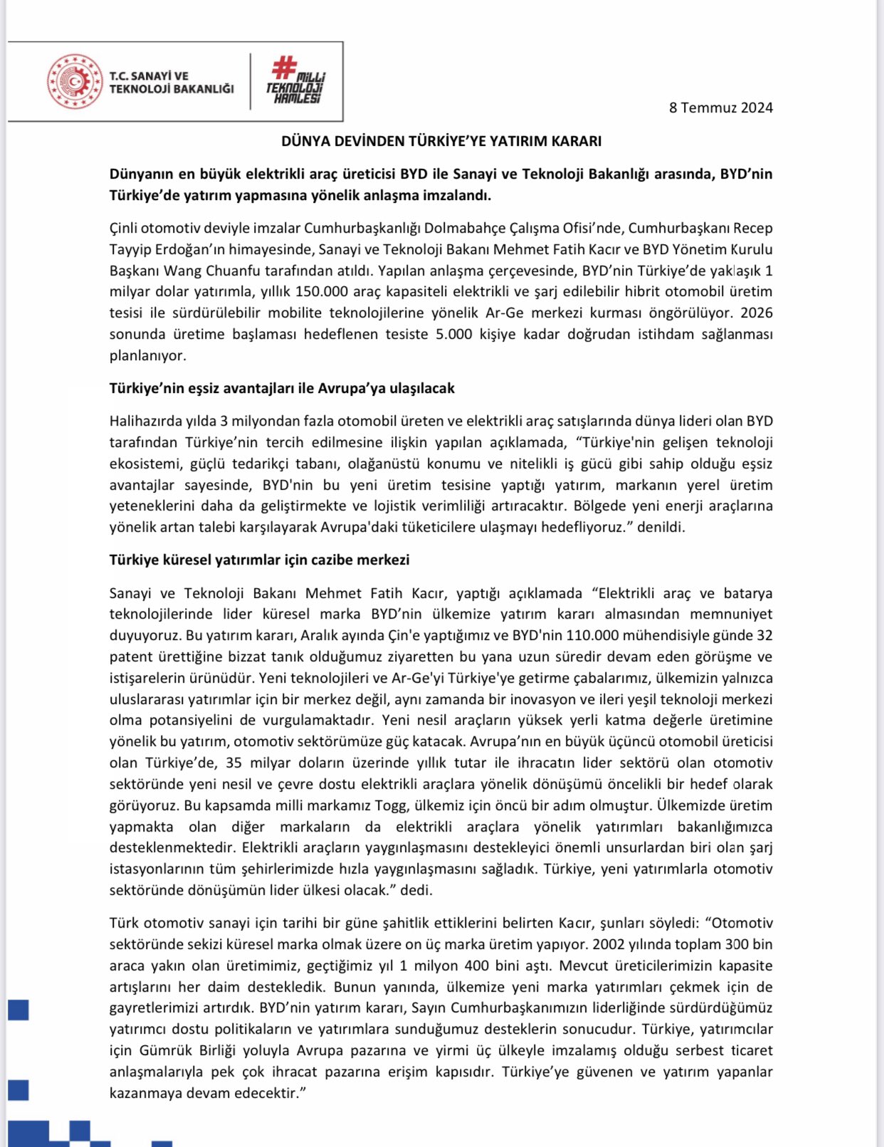 Çinli elektrikli araç üreticisi BYD ile Sanayi Bakanlığı arasında yatırım anlaşması imzalandı. Böylelikle Türkiye'ye 27 yıl sonra ilk kez otomotivde doğrudan yatırım gelmiş oldu. Dünyanın en büyük elektrikli araç üreticisi Çinli BYD firması ile Sanayi ve Teknoloji Bakanlığı arasında Türkiye'de yatırıma yönelik anlaşma imzalandı. İmzalar, Cumhurbaşkanlığı Dolmabahçe Çalışma Ofisi’nde, Cumhurbaşkanı Recep Tayyip Erdoğan’ın himayesinde, Sanayi ve Teknoloji Bakanı Mehmet Fatih Kacır ve BYD Yönetim Kurulu Başkanı Wang Chuanfu tarafından atıldı. Bakanlıktan yapılan açıklamaya göre yapılan anlaşma çerçevesinde, BYD’nin Türkiye’de yaklaşık 1 milyar dolar yatırımla, yıllık 150 bin araç kapasiteli elektrikli ve şarj edilebilir hibrit otomobil üretim tesisi ile sürdürülebilir mobilite teknolojilerine yönelik Ar-Ge merkezi kurması öngörülüyor. 2026 sonunda üretime başlaması hedeflenen tesiste 5.000 kişiye kadar doğrudan istihdam sağlanması planlanıyor. Halihazırda yılda 3 milyondan fazla otomobil üreten ve elektrikli araç satışlarında dünya lideri olan BYD tarafından Türkiye’nin tercih edilmesine ilişkin yapılan açıklamada, “Türkiye'nin gelişen teknoloji ekosistemi, güçlü tedarikçi tabanı, olağanüstü konumu ve nitelikli iş gücü gibi sahip olduğu eşsiz avantajlar sayesinde, BYD'nin bu yeni üretim tesisine yaptığı yatırım, markanın yerel üretim yeteneklerini daha da geliştirmekte ve lojistik verimliliği artıracaktır. Bölgede yeni enerji araçlarına yönelik artan talebi karşılayarak Avrupa'daki tüketicilere ulaşmayı hedefliyoruz.” denildi. Sanayi ve Teknoloji Bakanı Mehmet Fatih Kacır ise yaptığı açıklamada “Elektrikli araç ve batarya teknolojilerinde lider küresel marka BYD’nin ülkemize yatırım kararı almasından memnuniyet duyuyoruz. Bu yatırım kararı, Aralık ayında Çin'e yaptığımız ve BYD'nin 110.000 mühendisiyle günde 32 patent ürettiğine bizzat tanık olduğumuz ziyaretten bu yana uzun süredir devam eden görüşme ve istişarelerin ürünüdür. Yeni teknolojileri ve Ar-Ge'yi Türkiye'ye getirme çabalarımız, ülkemizin yalnızca uluslararası yatırımlar için bir merkez değil, aynı zamanda bir inovasyon ve ileri yeşil teknoloji merkezi olma potansiyelini de vurgulamaktadır. Yeni nesil araçların yüksek yerli katma değerle üretimine yönelik bu yatırım, otomotiv sektörümüze güç katacak. Avrupa’nın en büyük üçüncü otomobil üreticisi olan Türkiye’de, 35 milyar doların üzerinde yıllık tutar ile ihracatın lider sektörü olan otomotiv sektöründe yeni nesil ve çevre dostu elektrikli araçlara yönelik dönüşümü öncelikli bir hedef olarak görüyoruz. Bu kapsamda milli markamız Togg, ülkemiz için öncü bir adım olmuştur. Ülkemizde üretim yapmakta olan diğer markaların da elektrikli araçlara yönelik yatırımları bakanlığımızca desteklenmektedir. Elektrikli araçların yaygınlaşmasını destekleyici önemli unsurlardan biri olan şarj istasyonlarının tüm şehirlerimizde hızla yaygınlaşmasını sağladık. Türkiye, yeni yatırımlarla otomotiv sektöründe dönüşümün lider ülkesi olacak.” ifadelerini kullandı. Otomotivde 27 yıl sonra gelen ilk doğrudan yatırım Böylelikle Türkiye'ye 27 yıl sonra ilk kez otomotivde doğrudan yatırım gelmiş oldu. Son olarak 1997 yılında Türkiye'ye yatırım yapma kararı alan Honda, 24 yıl üretime devam ettikten sonra 2019 yılında gerçekleştirdiği bir duyuru ile Gebze’de bulunan ve Türkiye’de de fazlasıyla popüler olan Civic modelini ürettiği fabrikasında 2021 yılı Eylül ayında üretimi durduracağını açıklamış ve fabrikayı resmen kapatmıştı. [news_id:738821] [news_id:738889] [news_id:738916] [news_id:738736]