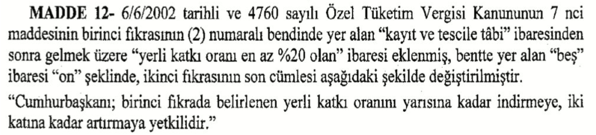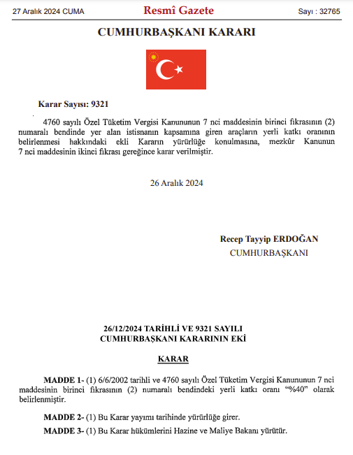 Özel Tüketim Vergisi (ÖTV) muafiyetiyle satın alınan araçlarla ilgili önemli düzenlemeler Resmi Gazete’de yayınlanarak yürürlüğe girdi. Yeni düzenlemeye göre, ÖTV muafiyetinden yararlanacak araçlarda %40 yerlilik oranı zorunluluğu getirildi. Ayrıca, bu araçların satış süresi 5 yıldan 10 yıla uzatıldı. Daha önce Meclis’te kabul edilen düzenlemede, %20 yerlilik oranı şartı öngörülmüş ve satış süresi yine 10 yıl olarak belirlenmişti ancak Cumhurbaşkanına verilen yetki kapsamında yerlilik oranı %40’a çıkarıldı. Kararın Resmi Gazete’de yayınlanmasıyla birlikte resmen yürürlüğe girdi. Bilindiği üzere, Cumhurbaşkanı yetkisi ile yerli katkı payının yarıya kadar indirilmesi veya iki katına kadar artırılması mümkün. Peki bu kararın ardından alınabilecek otomobiller hangileri? Fiat Egea Sedan Fiat Egea Cross Fiat Egea Cross Wagon Togg T10X. TOGG'un yerlilik oranı kaç? TOGG’un üretim başlangıcında yerlilik oranı %51’in üzerindeydi. Üç yıl içinde bu oran %68’e yükseldi. İş ortaklarının %75’i Türkiye merkezliyken, %25’i Avrupa, Asya ve Kuzey Amerika’dan geliyor. Toyota Corolla Toyota C-HR Renault Clio Renault Duster Renault Megane Hyundai i10 Hyundaii20 Hyundai Bayon ÖTV muafiyeti sağlanan araçlarda alım limiti ne kadar? 2025 yılında ÖTV muafiyetiyle satın alınabilecek araçlar için üst limit 2.247.114 TL olarak belirlendi. Engelli raporuna sahip vatandaşlar, %40 ve üzeri yerli katkı oranına sahip, vergiler dahil satış fiyatı 2.247.114 TL’yi aşmayan otomobilleri ÖTV muafiyetiyle alabilecek.
