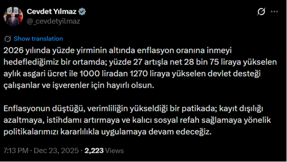 Cumhurbaşkanı Yardımcısı Cevdet Yılmaz, 2026 yılında geçerli olacak asgari ücretin belirlenmesinin ardından yaptığı açıklamada, “Kalıcı sosyal refah sağlamaya yönelik politikalarımızı kararlılıkla uygulamaya devam edeceğiz.” dedi. Cumhurbaşkanı Yardımcısı Cevdet Yılmaz, sosyal medya hesabından 2026 yılı asgari ücretini değerlendirdi. Yılmaz, konuya ilişkin paylaşımında şunları aktardı: “2026 yılında yüzde yirminin altında enflasyon oranına inmeyi hedeflediğimiz bir ortamda; yüzde 27 artışla net 28 bin 75 liraya yükselen aylık asgari ücret ile 1000 liradan 1270 liraya yükselen devlet desteği çalışanlar ve işverenler için hayırlı olsun. Enflasyonun düştüğü, verimliliğin yükseldiği bir patikada; kayıt dışılığı azaltmaya, istihdamı artırmaya ve kalıcı sosyal refah sağlamaya yönelik politikalarımızı kararlılıkla uygulamaya devam edeceğiz.” [news_id:796305]