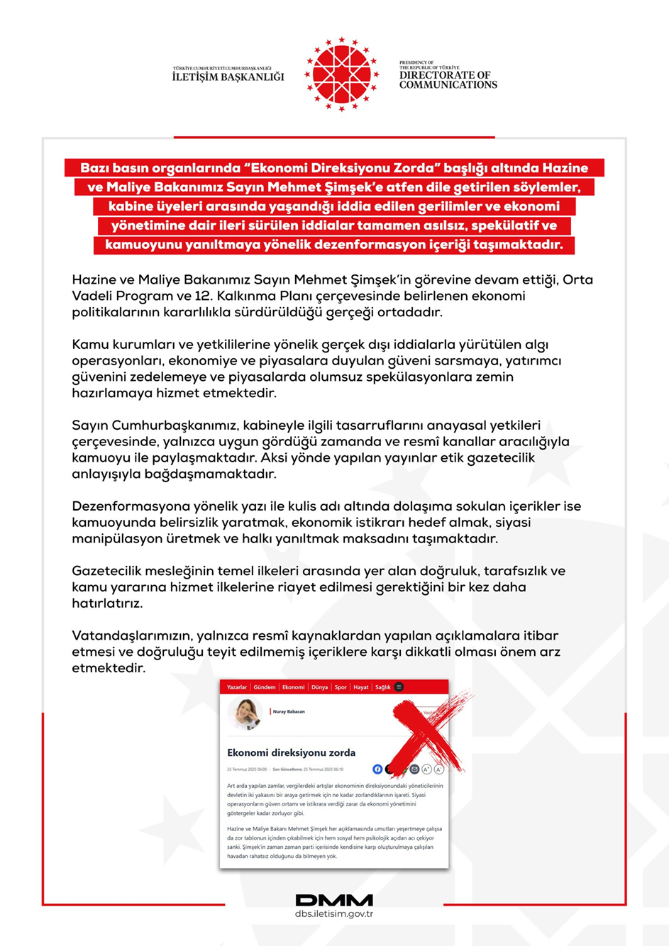 Cumhurbaşkanlığı İletişim Başkanlığı Dezenformasyonla Mücadele Merkezi, Kabine üyeleri arasında yaşandığı iddia edilen gerilimler ve ekonomi yönetimine dair ileri sürülen iddiaların tamamen asılsız olduğunu duyurdu. Dezenformasyonla Mücadele Merkezi tarafından sosyal medyada ve bazı basın yayın organlarında yer alan haberlerin ardından açıklama yapıldı. DMM'den yapılan açıklamada şunlar aktarıldı: “Bazı basın organlarında “Ekonomi Direksiyonu Zorda” başlığı altında Hazine ve Maliye Bakanımız Sayın Mehmet Şimşek’e atfen dile getirilen söylemler, kabine üyeleri arasında yaşandığı iddia edilen gerilimler ve ekonomi yönetimine dair ileri sürülen iddialar tamamen asılsız, spekülatif ve kamuoyunu yanıltmaya yönelik dezenformasyon içeriği taşımaktadır. Hazine ve Maliye Bakanımız Sayın Mehmet Şimşek’in görevine devam ettiği, Orta Vadeli Program ve 12. Kalkınma Planı çerçevesinde belirlenen ekonomi politikalarının kararlılıkla sürdürüldüğü gerçeği ortadadır. Kamu kurumları ve yetkililerine yönelik gerçek dışı iddialarla yürütülen algı operasyonları, ekonomiye ve piyasalara duyulan güveni sarsmaya, yatırımcı güvenini zedelemeye ve piyasalarda olumsuz spekülasyonlara zemin hazırlamaya hizmet etmektedir. Sayın Cumhurbaşkanımız, kabineyle ilgili tasarruflarını anayasal yetkileri çerçevesinde, yalnızca uygun gördüğü zamanda ve resmî kanallar aracılığıyla kamuoyu ile paylaşmaktadır. Aksi yönde yapılan yayınlar etik gazetecilik anlayışıyla bağdaşmamaktadır. Dezenformasyona yönelik yazı ile kulis adı altında dolaşıma sokulan içerikler ise kamuoyunda belirsizlik yaratmak, ekonomik istikrarı hedef almak, siyasi manipülasyon üretmek ve halkı yanıltmak maksadını taşımaktadır. Gazetecilik mesleğinin temel ilkeleri arasında yer alan doğruluk, tarafsızlık ve kamu yararına hizmet ilkelerine riayet edilmesi gerektiğini bir kez daha hatırlatırız. Vatandaşlarımızın, yalnızca resmî kaynaklardan yapılan açıklamalara itibar etmesi ve doğruluğu teyit edilmemiş içeriklere karşı dikkatli olması önem arz etmektedir.” Kaynak: DMM