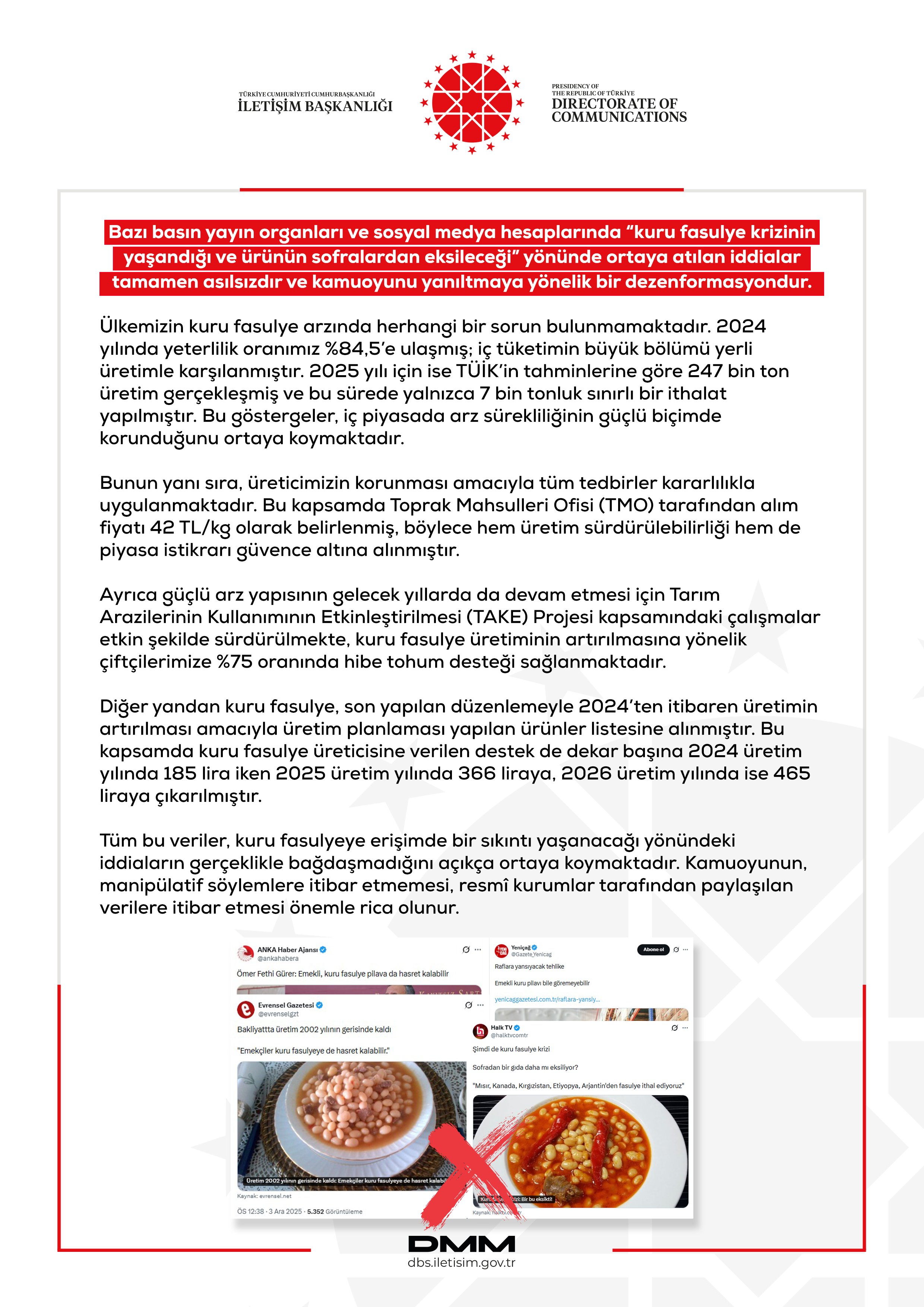 Cumhurbaşkanlığı İletişim Başkanlığı Dezenformasyonla Mücadele Merkezi (DMM), 'kuru fasulye krizinin yaşandığı ve ürünün sofralardan eksileceği' iddiasının doğru olmadığını bildirdi. İletişim Başkanlığı Dezenformasyonla Mücadele Merkezi, basında ve sosyal medya hesaplarında yer alan "kuru fasulye krizinin yaşandığı ve ürünün sofralardan eksileceği" yönündeki iddiaların tamamen asılsız olduğunu, Türkiye’nin kuru fasulye arzında herhangi bir sorun bulunmadığını açıkladı. Dezenformasyonla Mücadele Merkezi’nin (DMM) sosyal medya hesabından yapılan açıklamada, söz konusu iddiaların kamuoyunu yanıltmaya yönelik dezenformasyon niteliği taşıdığı vurgulandı. DMM’nin konuya ilişkin paylaşımı şöyle oldu: “Bazı basın yayın organları ve sosyal medya hesaplarında “kuru fasulye krizinin yaşandığı ve ürünün sofralardan eksileceği” yönünde ortaya atılan iddialar tamamen asılsızdır ve kamuoyunu yanıltmaya yönelik bir dezenformasyondur. Ülkemizin kuru fasulye arzında herhangi bir sorun bulunmamaktadır. 2024 yılında yeterlilik oranımız %84,5’e ulaşmış; iç tüketimin büyük bölümü yerli üretimle karşılanmıştır. 2025 yılı için ise TÜİK’in tahminlerine göre 247 bin ton üretim gerçekleşmiş ve bu sürede yalnızca 7 bin tonluk sınırlı bir ithalat yapılmıştır. Bu göstergeler, iç piyasada arz sürekliliğinin güçlü biçimde korunduğunu ortaya koymaktadır. Bunun yanı sıra, üreticimizin korunması amacıyla tüm tedbirler kararlılıkla uygulanmaktadır. Bu kapsamda Toprak Mahsulleri Ofisi (TMO) tarafından alım fiyatı 42 TL/kg olarak belirlenmiş, böylece hem üretim sürdürülebilirliği hem de piyasa istikrarı güvence altına alınmıştır. Ayrıca güçlü arz yapısının gelecek yıllarda da devam etmesi için Tarım Arazilerinin Kullanımının Etkinleştirilmesi (TAKE) Projesi kapsamındaki çalışmalar etkin şekilde sürdürülmekte, kuru fasulye üretiminin artırılmasına yönelik çiftçilerimize %75 oranında hibe tohum desteği sağlanmaktadır. Diğer yandan kuru fasulye, son yapılan düzenlemeyle 2024’ten itibaren üretimin artırılması amacıyla üretim planlaması yapılan ürünler listesine alınmıştır. Bu kapsamda kuru fasulye üreticisine verilen destek de dekar başına 2024 üretim yılında 185 lira iken 2025 üretim yılında 366 liraya, 2026 üretim yılında ise 465 liraya çıkarılmıştır. Tüm bu veriler, kuru fasulyeye erişimde bir sıkıntı yaşanacağı yönündeki iddiaların gerçeklikle bağdaşmadığını açıkça ortaya koymaktadır. Kamuoyunun, manipülatif söylemlere itibar etmemesi, resmî kurumlar tarafından paylaşılan verilere itibar etmesi önemle rica olunur.” Kaynak: DMM