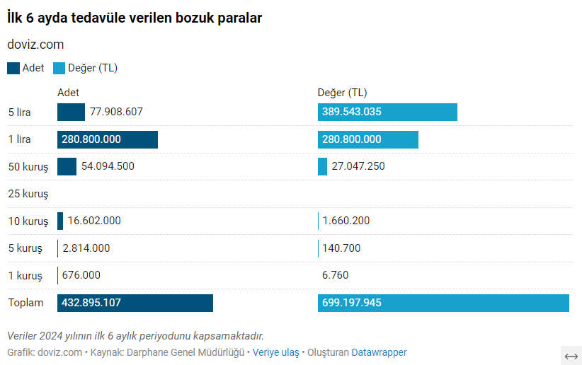 Darphane verilerine göre 2024 yılının ilk altı ayında Türk halkının cebine 699 milyon 197 bin 945 liralık bozuk para girdi. Yılın ilk yarısında 25 kuruş üretimi askıya alınırken, bu dönemde madeni paralardan en çok 1 lira tedavüle verildi. Darphane ve Damga Matbaası Genel Müdürlüğü verilerinden derlenen bilgilere göre, 6 aylık dönemde tedavüle verilen madeni para miktarı 432 milyon 895 bin 107 adet oldu. Piyasaya sunulan bozuk paraların değeri ise 699 milyon 197 bin 945 lira olarak hesaplandı. Altı aylık dönemde 77 milyon 908 bin 607 adet 5 lira, 280 milyon 800 bin adet 1 lira, 54 milyon 94 bin 500 adet 50 kuruş, 16 milyon 602 bin adet 10 kuruş, 2 milyon 814 bin adet 5 kuruş ve 676 bin adet 1 kuruş dolaşıma sunuldu. En çok tedavüle verilen bozuk para 1 lira olurken, 6 aylık süreçte 25 kuruş dolaşıma sokulmadı. [news_id:735676] Cepte en fazla 1 lira bulunuyor TL'den "yeni" ibaresi kaldırıldıktan sonra 1 Ocak 2009'dan bu yana tedavüle sokulan madeni paralara bakıldığında, vatandaşın cebinde 4 milyar 4 milyon 815 bin 610 adetle en fazla 1 lira bulunuyor. Geçen yılın aralık ayında hatıra parası olarak Darphane tarafından tedavüle çıkarılan ve haziran ayında tedavüle çıkarılmasına ilişkin tebliğ yayımlanan 5 liraların sayısı ise 99 milyon 689 bin 807 ile piyasadaki en az bulunan bozuk para oldu. 2009'dan bu yana cepte taşınan bozuk para miktarı 12 milyar 640 milyon 75 bin 976'ya yükselirken, nüfusu yaklaşık 85,3 milyon olan Türkiye'de kişi başına ortalama 148 adet bozuk para düşüyor. [news_id:675236]