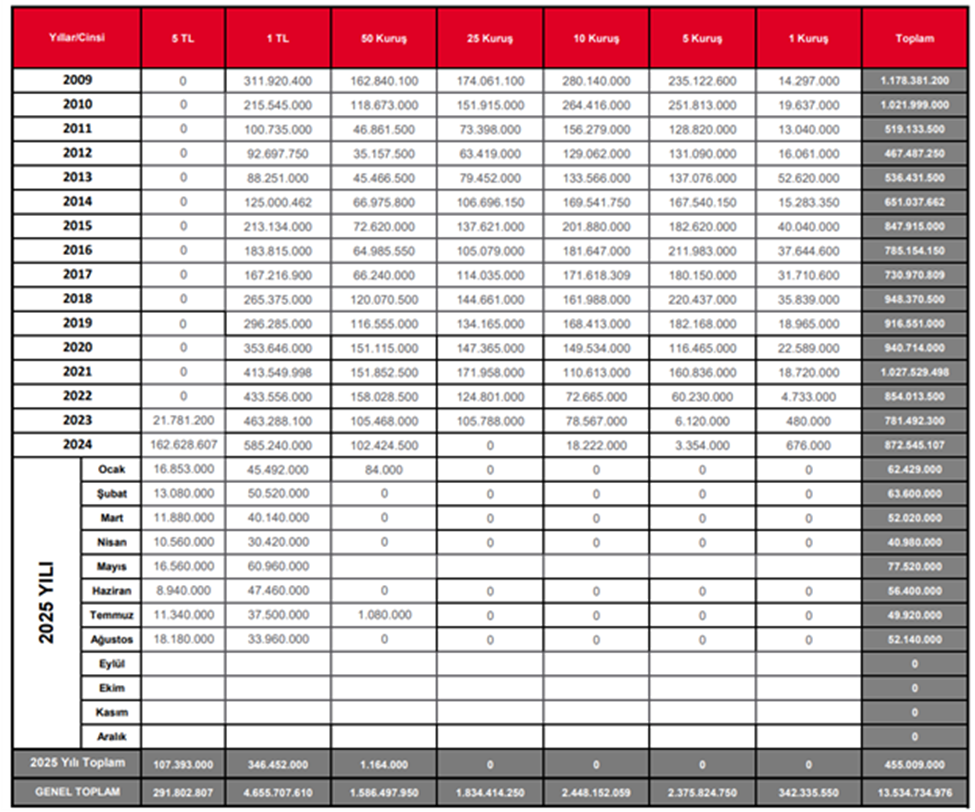 Türkiye'de son dönemde yaşanan yüksek enflasyon, sadece ürün fiyatlarını değil madeni paraları da etkiliyor. Darphane'nin son verileri, küçük kupürlü madeni paraların üretiminin neredeyse durduğunu, piyasadaki ağırlığın ise 1 TL ve 5 TL'ye kaydığını gösteriyor. Darphane ve Damga Matbaası Genel Müdürlüğü verilerinden derlenen bilgilere göre 2025 yılının ilk sekiz ayında Darphane tarafından basılan 455 milyon adet madeni paranın büyük bir kısmı 1 TL’lerden oluştu. İlk sekiz ayda 346,4 milyon adet 1 TL, 107,3 milyon adet ise 5 TL'lik madeni para üretimi gerçekleştirildi. Buna karşılık 50 kuruşun üretimi yalnızca 1,1 milyon adet ile sınırlı kaldı. Bu dönemde 25, 10, 5 ve 1 kuruşluk madeni paraların basımı ise tamamen durdu. 5 TL'nin yükselişi Cumhuriyet'in 100. yılı anısına 2023 yılında hatıra amaçlı basılmaya başlanan madeni 5 TL, kısa sürede nakit alışverişinin vazgeçilmez bir parçası haline geldi. 2023'te 21,7 milyon adetle başlayan üretim, 2024'te 162,6 milyon adede çıktı. 2025'in sekiz ayında basılan 107,3 milyon adetle birlikte piyasadaki toplam 5 TL sayısı da 291 milyonu aştı. 50 kuruş üretimi yeniden askıya aldı Geçmiş yıllarda 100-170 milyon adet aralığında üretimi yapılan 50 kuruş ise bu yıl piyasadan silinme noktasına geldi. Ocak ayında sadece 84 bin adet basılan madeni paranın üretimi, temmuz ayındaki 1,1 milyon adetlik sınırlı bir basımla yeniden başladı. Ancak Darphane, ağustos ayında 50 kuruş üretimini yeniden askıya alma kararı aldı. Kaynak: Darphane ve Damga Matbaası Genel Müdürlüğü
