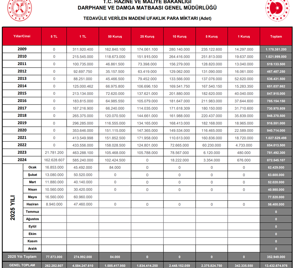 Darphane verilerine göre 2025 yılının ilk altı ayında Türk halkının cebine 664 milyon 399 bin liralık bozuk para girdi. Enflasyonun gölgesinde hatıra para olarak basılan 5 TL’ler yerini sağlamlaştırırken kuruşların üretimi ise askıya alındı. Darphane ve Damga Matbaası Genel Müdürlüğü verilerinden derlenen bilgilere göre, 6 aylık dönemde tedavüle verilen madeni para miktarı 352 milyon 949 bin oldu. Piyasaya sunulan bozuk paraların değeri ise 664 milyon 399 bin lira olarak hesaplandı. Altı aylık dönemde 77 milyon 873 bin adet 5 lira, 274 milyon 992 bin adet 1 lira ve 84 bin adet 50 kuruş dolaşıma sunuldu. En çok tedavüle verilen bozuk para 1 lira olurken, 6 aylık süreçte 25 kuruş ve altındaki değere sahip paraların dolaşıma sokulmadığı görüldü. Öte yandan ocak ayında dolaşıma sunulan 84 bin adet 50 kuruşun dışında 50 kuruş üretiminin de gerçekleşmediği tespit edildi. Kaynak: Darphane Cepte en fazla 1 lira bulunuyor TL'den "yeni" ibaresi kaldırıldıktan sonra 1 Ocak 2009'dan bu yana tedavüle sokulan madeni paralara bakıldığında, cepte taşınan bozuk para miktarının 13 milyar 432 milyon 674 bin 976'ya yükseldiği görüldü. İlgili dönemde vatandaşın cebinde 4 milyar 584 milyon 247 bin 610 adetle en fazla 1 liranın bulunduğu ortaya çıktı. Geçtiğimiz yıllarda hatıra parası olarak Darphane tarafından tedavüle çıkarılan ve dolaşımda kalmaya devam etmesine ilişkin tebliğ yayımlanan 5 liralar ise 262 milyon 282 bin 807 adet ile piyasadaki yerini sağlamlaştırmaya başladı. [news_id:761988]