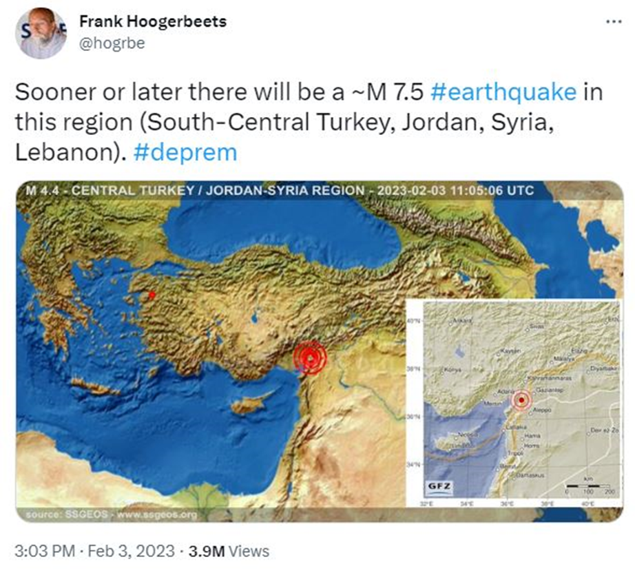'Deprem kahini' olarak tanınan dünyaca ünlü deprem uzmanı Frank Hoogerbeets, Kahramanmaraş'ta bugün meydana gelen depremle ilgili olarak 3 gün önceden uyarıda bulundu. Hoogerbeets, 3 Şubat'ta yaptığı Twitter paylaşımında haritada Hatay, Osmaniye ve Kahramanmaraş yakınlarını işaretleyerek, "Eninde sonunda bu bölgede yaklaşık 7.5 büyüklüğünde bir deprem meydana gelecek (Güney-Merkez Türkiye, Ürdün, Suriye, Lübnan)" yazdı. Kaynak: Frank Hoogerbeets - Twitter Bu sabah saat 4:17 sularında Kahramanmaraş’ın Pazarcık ilçesinde 7.4 büyüklüğünde bir deprem meydana geldi. Kahramanmaraş'ta meydana gelen deprem Suriye'yi de etkiledi. Halep, Hama ve Lazkiye'de en az 42 kişinin öldüğü, 200 kişinin yaralandığı açıklandı. “En İyi Avustralyalı Gökbilimciler” listesinde bulunan Frank Hoogerbeets, 2002 yılında depremlerle ilgili Ditrianum adlı siteyi kurdu. Hoogerbeets, 25 Nisan 2015 tarihinde Nepal'de meydana gelen 7.8 büyüklüğünde depremi tahmin edince 'deprem kahini' olarak anılmaya başlamıştı.