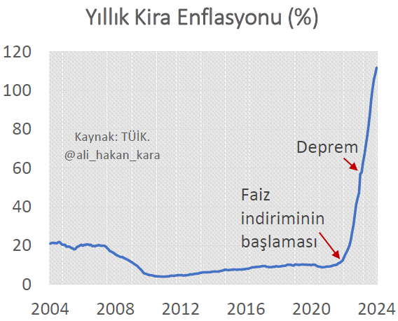 Prof. Dr. Hakan Kara, asrın felaketinin birinci yılında kira enflasyonunun yakın tarihte ilk defa üç haneli değerleri gördüğünü söyledi. Türkiye, son yıllarda ekonomi politikaları ve doğal afetlerin etkisiyle ciddi bir barınma sorunuyla karşı karşıya kaldı. Özellikle 2021 yılı ortalarından itibaren konut kiralarında önemli bir artış yaşandı. 2021 yılının ortalarına denk gelen faiz indirimi sürecinin normal şartlar altında konut kredisi ve yatırımlar üzerinde olumlu etki yaratması beklenirken, enflasyonist baskılar ise kiralarda ciddi bir yükselişe neden olmuştu. TCMB eski Başekonomisti Prof. Dr. Hakan Kara'nın sosyal medya hesabından paylaştığı grafik de faiz indirimlerinin başladığı dönemde konut kiralarının arttığını gözler önüne serdi. Kaynak: Hakan Kara - X Öte yandan barınma sorunu, 6 Şubat 2023'te yaşanan ve 11 ili etkileyen depremle daha da kötüleşti. Deprem bölgesinde konut kira fiyatları yüzde 120'yi aşacak şekilde zamlanırken, depremzedelerin yaşadığı barınma sorunu da hızla büyüdü. Prof. Dr. Hakan Kara da konuyla ilgili paylaşımında, "2021 yılında başlatılan yanlış para politikasının yol açtığı barınma krizi, depremzedelerin yaşadığı zorlukları büyüttü." dedi. [news_id:722705]