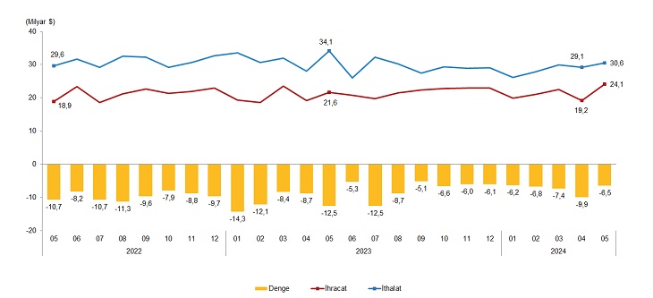 TÜİK verilerine nisan ayında dokuz ayın en yüksek seviyesine çıkan dış ticaret açığı mayısta yüzde 48 azaldı. TÜİK verilerine göre, dış ticaret açığı mayıs ayında yüzde 48 geriledi. Mayıs ayında dış ticaret açığı bir önceki yılın aynı ayına göre yüzde 48 azalarak 12 milyar 495 milyon dolardan, 6 milyar 502 milyon dolara geriledi. İhracatın ithalatı karşılama oranı 2023 Mayıs ayında yüzde 63,4 iken, 2024 Mayıs ayında yüzde 78,7'ye yükseldi. Ocak-Mayıs döneminde ise dış ticaret açığı %34,3 azalarak 56 milyar 33 milyon dolardan, 36 milyar 805 milyon dolara geriledi. İhracatın ithalatı karşılama oranı 2023 Ocak-Mayıs döneminde %64,6 iken, 2024 yılının aynı döneminde %74,4'e yükseldi. Kaynak: TÜİK Ekonomik faaliyetlere göre ihracatta, 2024 Mayıs ayında imalat sanayinin payı %94,8, tarım, ormancılık ve balıkçılık sektörünün payı %3,1, madencilik ve taşocakçılığı sektörünün payı %1,7 oldu. Ocak-Mayıs döneminde ekonomik faaliyetlere göre ihracatta imalat sanayinin payı %94,2, tarım, ormancılık ve balıkçılık sektörünün payı %3,7, madencilik ve taşocakçılığı sektörünün payı %1,6 oldu.