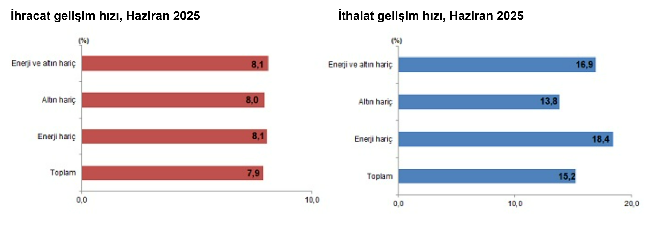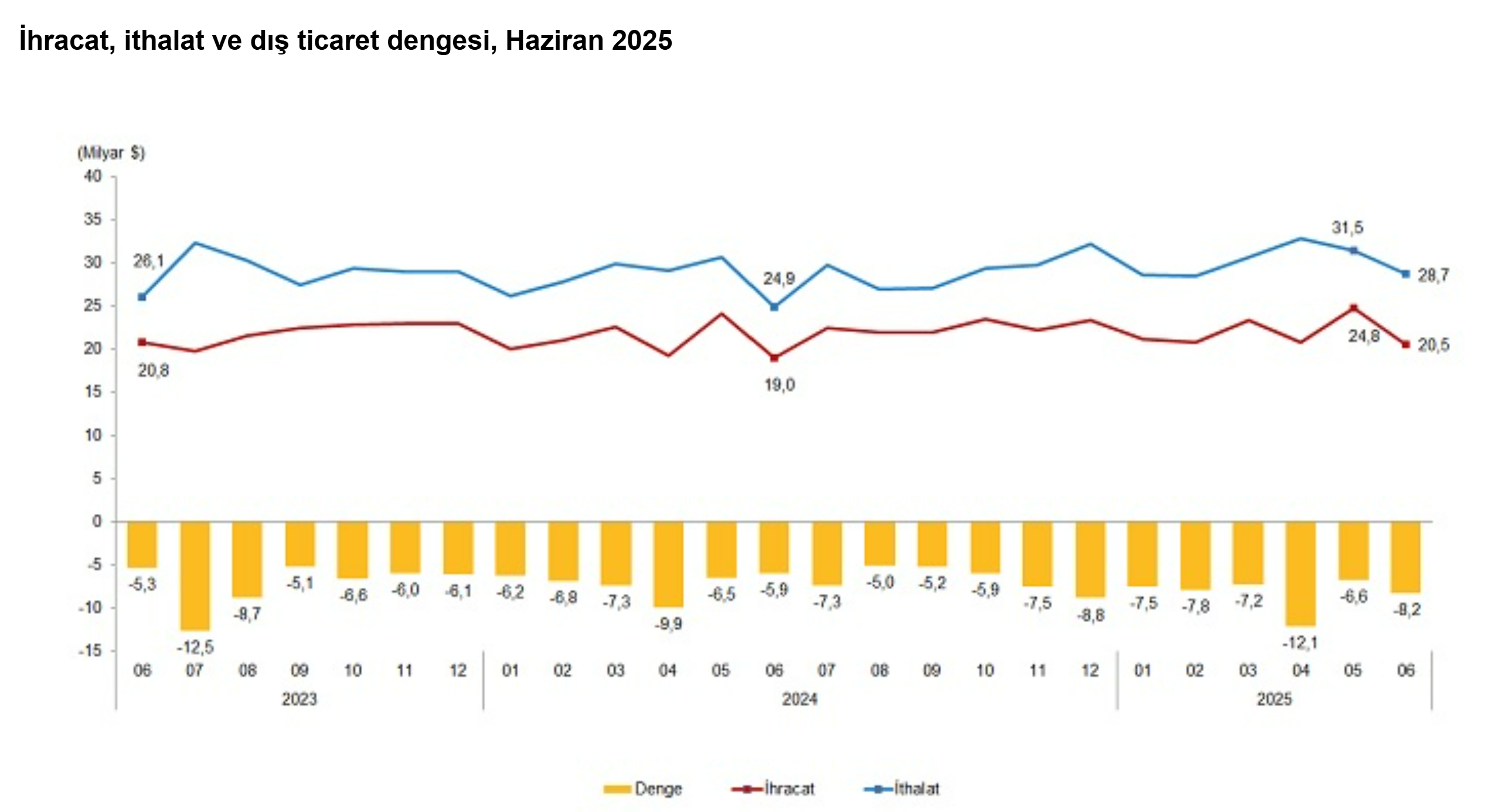 TÜİK verilerine göre haziran ayında dış ticaret açığı bir önceki yılın aynı ayına göre yüzde 38,8 artarak 8 milyar 173 milyon dolara yükseldi. Türkiye İstatistik Kurumu (TÜİK), haziran ayına ve 2025'in tamamına ilişkin dış ticaret istatistiklerini açıkladı. TÜİK verilerine göre ihracat, 2025 yılı Haziran ayında, bir önceki yılın aynı ayına göre %7,9 artarak 20 milyar 515 milyon dolar, ithalat %15,2 artarak 28 milyar 688 milyon dolar olarak gerçekleşti. Genel ticaret sistemine göre ihracat 2025 yılı Ocak-Haziran döneminde bir önceki yılın aynı dönemine göre %4,1 artarak 131 milyar 408 milyon dolar, ithalat %7,2 artarak 180 milyar 845 milyon dolar olarak gerçekleşti. Enerji ürünleri ve altın hariç ihracat %8,1, ithalat %16,9 arttı Enerji ürünleri ve parasal olmayan altın hariç ihracat, 2025 Haziran ayında %8,1 artarak 17 milyar 532 milyon dolardan, 18 milyar 955 milyon dolara yükseldi. Haziran ayında enerji ürünleri ve parasal olmayan altın hariç ithalat %16,9 artarak 19 milyar 285 milyon dolardan, 22 milyar 544 milyon dolara yükseldi. Enerji ürünleri ve parasal olmayan altın hariç dış ticaret açığı Haziran ayında 3 milyar 588 milyon dolar olarak gerçekleşti. Dış ticaret hacmi %12,7 artarak 41 milyar 499 milyon dolar olarak gerçekleşti. Söz konusu ayda enerji ve altın hariç ihracatın ithalatı karşılama oranı %84,1 oldu. Dış ticaret açığı Haziran ayında %38,8 arttı Haziran ayında dış ticaret açığı bir önceki yılın aynı ayına göre %38,8 artarak 5 milyar 889 milyon dolardan, 8 milyar 173 milyon dolara yükseldi. İhracatın ithalatı karşılama oranı 2024 Haziran ayında %76,4 iken, 2025 Haziran ayında %71,5 oldu. Ocak-Haziran döneminde dış ticaret açığı %16,3 artarak 42 milyar 504 milyon dolardan, 49 milyar 437 milyon dolara yükseldi. İhracatın ithalatı karşılama oranı 2024 Ocak-Haziran döneminde %74,8 iken, 2025 yılının aynı döneminde %72,7'ye geriledi. Haziran ayında en fazla ihracat yapılan ülke Almanya oldu Haziran ayında ihracatta ilk sırayı Almanya aldı. Almanya'ya yapılan ihracat 1 milyar 728 milyon dolar olurken, bu ülkeyi sırasıyla; 1 milyar 266 milyon dolar ile Birleşik Krallık, 1 milyar 197 milyon dolar ile ABD, 1 milyar 70 milyon dolar ile İtalya, 890 milyon dolar ile Fransa takip etti. İlk 5 ülkeye yapılan ihracat, toplam ihracatın %30,0'ını oluşturdu. Ocak-Haziran döneminde ihracatta ilk sırayı Almanya aldı. Almanya'ya yapılan ihracat 10 milyar 915 milyon dolar olurken, bu ülkeyi sırasıyla; 8 milyar 164 milyon dolar ile Birleşik Krallık, 7 milyar 837 milyon dolar ile ABD, 6 milyar 662 milyon dolar ile İtalya ve 5 milyar 636 milyon dolar ile Irak takip etti. İlk 5 ülkeye yapılan ihracat, toplam ihracatın %29,8'ini oluşturdu. İthalatta ilk sırayı Çin aldı İthalatta Çin ilk sırayı aldı. Haziran ayında Çin'den yapılan ithalat 3 milyar 831 milyon dolar olurken, bu ülkeyi sırasıyla; 3 milyar 316 milyon dolar ile Rusya Federasyonu, 2 milyar 698 milyon dolar ile Almanya, 1 milyar 468 milyon dolar ile ABD, 1 milyar 117 milyon dolar ile İsviçre izledi. İlk 5 ülkeden yapılan ithalat, toplam ithalatın %43,3'ünü oluşturdu. Ocak-Haziran döneminde ithalatta ilk sırayı Çin aldı. Çin'den yapılan ithalat 23 milyar 956 milyon dolar olurken, bu ülkeyi sırasıyla; 21 milyar 705 milyon dolar ile Rusya Federasyonu, 14 milyar 642 milyon dolar ile Almanya, 8 milyar 259 milyon dolar ile ABD, 7 milyar 984 milyon dolar ile İtalya izledi. İlk 5 ülkeden yapılan ithalat, toplam ithalatın %42,3'ünü oluşturdu.