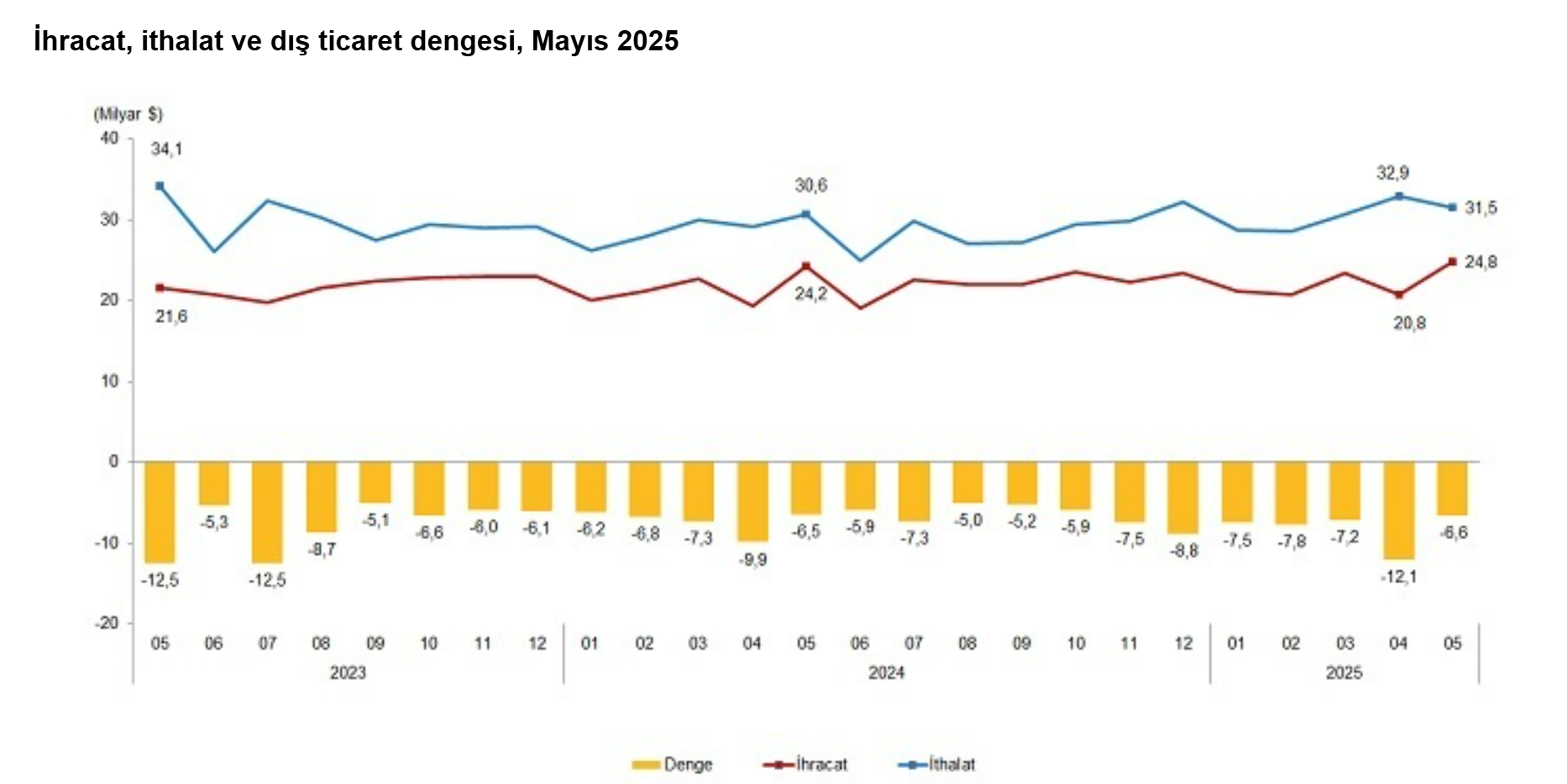 TÜİK verilerine göre 2025 yılının ilk beş ayında dış ticaret açığı bir önceki yılın aynı dönemine göre yüzde 12,7 artarak 41 milyar 257 milyon dolara yükseldi. Türkiye İstatistik Kurumu (TÜİK), mayıs ayı dış ticaret açığı verilerini açıkladı. Türkiye İstatistik Kurumu ile Ticaret Bakanlığı iş birliğiyle genel ticaret sistemi kapsamında üretilen geçici dış ticaret verilerine göre; ihracat 2025 yılı Mayıs ayında, bir önceki yılın aynı ayına göre %2,6 artarak 24 milyar 817 milyon dolar, ithalat %2,7 artarak 31 milyar 462 milyon dolar olarak gerçekleşti. Genel ticaret sistemine göre ihracat 2025 yılı Ocak-Mayıs döneminde bir önceki yılın aynı dönemine göre %3,4 artarak 110 milyar 904 milyon dolar, ithalat %5,8 artarak 152 milyar 160 milyon dolar olarak gerçekleşti. Enerji ürünleri ve parasal olmayan altın hariç ihracat, 2025 Mayıs ayında %5,0 artarak 22 milyar 87 milyon dolardan, 23 milyar 197 milyon dolara yükseldi. Mayıs ayında enerji ürünleri ve parasal olmayan altın hariç ithalat %4,3 artarak 24 milyar 51 milyon dolardan, 25 milyar 90 milyon dolara yükseldi. Enerji ürünleri ve parasal olmayan altın hariç dış ticaret açığı Mayıs ayında 1 milyar 893 milyon dolar olarak gerçekleşti. Dış ticaret hacmi %4,7 artarak 48 milyar 287 milyon dolar olarak gerçekleşti. Söz konusu ayda enerji ve altın hariç ihracatın ithalatı karşılama oranı %92,5 oldu. Dış ticaret açığı arttı Mayıs ayında dış ticaret açığı bir önceki yılın aynı ayına göre %2,7 artarak 6 milyar 468 milyon dolardan, 6 milyar 645 milyon dolara yükseldi. İhracatın ithalatı karşılama oranı 2024 Mayıs ayında %78,9 iken, 2025 Mayıs ayında %78,9 oldu. Ocak-Mayıs döneminde dış ticaret açığı %12,7 artarak 36 milyar 615 milyon dolardan, 41 milyar 257 milyon dolara yükseldi. İhracatın ithalatı karşılama oranı 2024 Ocak-Mayıs döneminde %74,5 iken, 2025 yılının aynı döneminde %72,9'a geriledi. Kaynak: TÜİK Mayıs ayında en fazla ihracat yapılan ülke Almanya oldu Mayıs ayında ihracatta ilk sırayı Almanya aldı. Almanya'ya yapılan ihracat 2 milyar 96 milyon dolar olurken, bu ülkeyi sırasıyla; 1 milyar 523 milyon dolar ile Birleşik Krallık, 1 milyar 511 milyon dolar ile ABD, 1 milyar 221 milyon dolar ile İtalya, 1 milyar 119 milyon dolar ile Irak takip etti. İlk 5 ülkeye yapılan ihracat, toplam ihracatın %30,1'ini oluşturdu. Ocak-Mayıs döneminde ihracatta ilk sırayı Almanya aldı. Almanya'ya yapılan ihracat 9 milyar 188 milyon dolar olurken, bu ülkeyi sırasıyla; 6 milyar 899 milyon dolar ile Birleşik Krallık, 6 milyar 641 milyon dolar ile ABD, 5 milyar 591 milyon dolar ile İtalya ve 4 milyar 874 milyon dolar ile Irak takip etti. İlk 5 ülkeye yapılan ihracat, toplam ihracatın %29,9'unu oluşturdu. İthalatta ilk sırayı Çin aldı İthalatta Çin ilk sırayı aldı. Mayıs ayında Çin'den yapılan ithalat 4 milyar 315 milyon dolar olurken, bu ülkeyi sırasıyla; 3 milyar 261 milyon dolar ile Rusya Federasyonu, 2 milyar 687 milyon dolar ile Almanya, 1 milyar 670 milyon dolar ile İtalya, 1 milyar 517 milyon dolar ile İsviçre izledi. İlk 5 ülkeden yapılan ithalat, toplam ithalatın %42,8'ini oluşturdu. Ocak-Mayıs döneminde ithalatta ilk sırayı Çin aldı. Çin'den yapılan ithalat 20 milyar 126 milyon dolar olurken, bu ülkeyi sırasıyla; 18 milyar 391 milyon dolar ile Rusya Federasyonu, 11 milyar 944 milyon dolar ile Almanya, 6 milyar 886 milyon dolar ile İtalya, 6 milyar 792 milyon dolar ile ABD izledi. İlk 5 ülkeden yapılan ithalat, toplam ithalatın %42,2'sini oluşturdu.