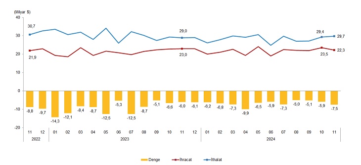 Kasım ayında dış ticaret açığı bir önceki yılın aynı ayına göre yüzde 24,9 artışla 7,5 milyar dolara yükseldi. Türkiye İstatistik Kurumu (TÜİK), kasım ayı dış ticaret istatistiklerini açıkladı. Kasım ayında dış ticaret açığı bir önceki yılın aynı ayına göre yüzde 24,9 artarak 5 milyar 973 milyon dolardan, 7 milyar 459 milyon dolara yükseldi. İhracatın ithalatı karşılama oranı 2023 Kasım ayında yüzde 79,4 iken, 2024 Kasım ayında yüzde 74,9'a geriledi. Enerji ürünleri ve parasal olmayan altın hariç ihracat, kasım ayında yüzde 0,1 artarak 20 milyar 764 milyon dolardan, 20 milyar 788 milyon dolara yükseldi. Kasım ayında enerji ürünleri ve parasal olmayan altın hariç ithalat yüzde 1 artarak 21 milyar 708 milyon dolardan, 21 milyar 933 milyon dolara yükseldi. Kasım ayında, bir önceki yılın aynı ayına göre yüzde 3,1 azalarak 22 milyar 289 milyon dolar, ithalat yüzde 2,7 artarak 29 milyar 748 milyon dolar olarak gerçekleşti. Kaynak: TÜİK 11 ayda dış açık yüzde 26,8 azaldı Ocak-kasım döneminde dış ticaret açığı yüzde 26,8 azalarak 100 milyar 240 milyon dolardan, 73 milyar 336 milyon dolara geriledi. İhracatın ithalatı karşılama oranı 2023 Ocak-Kasım döneminde yüzde 69,9 iken, 2024 yılının aynı döneminde yüzde 76,5'e yükseldi. İhracat 11 aylık dönemde bir önceki yılın aynı dönemine göre yüzde 2,5 artarak 238 milyar 462 milyon dolar, ithalat yüzde 6,3 azalarak 311 milyar 798 milyon dolar olarak gerçekleşti.