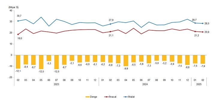 TÜİK verilerine göre şubat ayında dış ticaret açığı bir önceki yılın aynı ayına göre yüzde 14,8 artarak 7 milyar 771 milyon dolara yükseldi. Türkiye İstatistik Kurumu (TÜİK), şubat ayı dış ticaret açığı verilerini açıkladı. Şubat ayında ihracat bir önceki yılın aynı ayına göre yüzde 1,6 azalarak 20 milyar 761 milyon dolar, ithalat yüzde 2,4 artarak 28 milyar 533 milyon dolar olarak gerçekleşti. Şubat ayında dış ticaret açığı bir önceki yılın aynı ayına göre yüzde 14,8 artarak 6 milyar 767 milyon dolardan 7 milyar 771 milyon dolara yükseldi. İhracatın ithalatı karşılama oranı geçen yıl şubat ayında yüzde 75,7 iken bu yıl yüzde 72,8'e geriledi. Ocak-Şubat döneminde ise dış ticaret açığı %18,2 artarak 12 milyar 952 milyon dolardan 15 milyar 314 milyon dolara yükseldi. İhracatın ithalatı karşılama oranı da 2024 Ocak-Şubat döneminde %76,0 iken, 2025 yılının aynı döneminde %73,2'ye geriledi. Kaynak: TÜİK