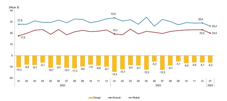 Türkiye İstatistik Kurumu (TÜİK) ocak ayına ilişkin dış ticaret istatistiklerini yayımladı. Türkiye İstatistik Kurumu ile Ticaret Bakanlığı iş birliğiyle genel ticaret sistemi kapsamında üretilen geçici dış ticaret verilerine göre; ihracat 2024 yılı Ocak ayında, bir önceki yılın aynı ayına göre yüzde 3,5 artarak 19 milyar 991 milyon dolar, ithalat yüzde 22,0 azalarak 26 milyar 218 milyon dolar olarak gerçekleşti. Dış ticaret açığı ise geçen yılın aynı ayına göre yüzde 56,4 düşerek 6 milyar 226 milyon dolara geriledi. İhracatın ithalatı karşılama oranı 2023 Ocak ayında %57,5 iken, 2024 Ocak ayında %76,2'ye yükseldi. Kaynak: TÜİK Ekonomik faaliyetlere göre ihracatta, 2024 Ocak ayında imalat sanayinin payı %93,0, tarım, ormancılık ve balıkçılık sektörünün payı %5,0, madencilik ve taşocakçılığı sektörünün payı %1,5 oldu. Geniş ekonomik gruplar sınıflamasına göre ithalatta, 2024 Ocak ayında ara mallarının payı %73,2, sermaye mallarının payı %14,0 ve tüketim mallarının payı %12,6 oldu. Ocak ayında en fazla ihracat yapılan ülke Almanya oldu Ocak ayında ihracatta ilk sırayı Almanya aldı. Almanya'ya yapılan ihracat 1 milyar 762 milyon dolar olurken, bu ülkeyi sırasıyla; 1 milyar 224 milyon dolar ile ABD, 1 milyar 97 milyon dolar ile Irak, 1 milyar 22 milyon dolar ile Birleşik Krallık, 999 milyon dolar ile İtalya takip etti. İlk 5 ülkeye yapılan ihracat, toplam ihracatın %30,5'ini oluşturdu. İthalatta ilk sırayı Rusya Federasyonu aldı İthalatta Rusya Federasyonu ilk sırayı aldı. Ocak ayında Rusya Federasyonu'ndan yapılan ithalat 4 milyar 324 milyon dolar olurken, bu ülkeyi sırasıyla; 2 milyar 893 milyon dolar ile Çin, 1 milyar 918 milyon dolar ile Almanya, 1 milyar 402 milyon dolar ile ABD, 1 milyar 187 milyon dolar ile İtalya izledi. İlk 5 ülkeden yapılan ithalat, toplam ithalatın %44,7'sini oluşturdu. Kaynak: TÜİK