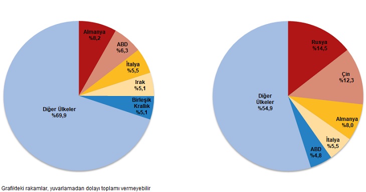 Şubat ayında dış ticaret açığı bir önceki yılın aynı dönemine göre %44,2 düşüşle 6,77 milyar dolara geriledi. TÜİK, şubat ayına ilişkin Dış Ticaret İstatistikleri'ni yayımladı. TÜİK verilerine göre ihracat 2024 yılı Şubat ayında, bir önceki yılın aynı ayına göre %13,6 artarak 21 milyar 82 milyon dolar, ithalat %9,2 azalarak 27 milyar 853 milyon dolar olarak gerçekleşti. Genel ticaret sistemine göre ihracat 2024 yılı Ocak-Şubat döneminde bir önceki yılın aynı dönemine göre %8,5 artarak 41 milyar 78 milyon dolar, ithalat %16,0 azalarak 54 milyar 33 milyon dolar olarak gerçekleşti. Kaynak: TÜİK Şubat ayında enerji ürünleri ve altın hariç ihracat %12,3, ithalat %5,2 arttı Enerji ürünleri ve parasal olmayan altın hariç ihracat, 2024 Şubat ayında %12,3 artarak 17 milyar 438 milyon dolardan, 19 milyar 589 milyon dolara yükseldi. Şubat ayında enerji ürünleri ve parasal olmayan altın hariç ithalat %5,2 artarak 19 milyar 958 milyon dolardan, 20 milyar 989 milyon dolara yükseldi. Enerji ürünleri ve parasal olmayan altın hariç dış ticaret açığı Şubat ayında 1 milyar 400 milyon dolar olarak gerçekleşti. Dış ticaret hacmi %8,5 artarak 40 milyar 578 milyon dolar olarak gerçekleşti. Söz konusu ayda enerji ve altın hariç ihracatın ithalatı karşılama oranı %93,3 oldu. Kaynak: TÜİK Dış ticaret açığı Şubat ayında %44,2 azaldı Şubat ayında dış ticaret açığı bir önceki yılın aynı ayına göre %44,2 azalarak 12 milyar 130 milyon dolardan, 6 milyar 771 milyon dolara geriledi. İhracatın ithalatı karşılama oranı 2023 Şubat ayında %60,5 iken, 2024 Şubat ayında %75,7'ye yükseldi. Dış ticaret açığı Ocak-Şubat döneminde %51,0 azaldı Ocak-Şubat döneminde dış ticaret açığı %51,0 azalarak 26 milyar 419 milyon dolardan, 12 milyar 955 milyon dolara geriledi. İhracatın ithalatı karşılama oranı 2023 Ocak-Şubat döneminde %58,9 iken, 2024 yılının aynı döneminde %76,0'a yükseldi. İhracat, ithalat ve dış ticaret dengesi, Şubat 2024 Kaynak: TÜİK Şubat ayında imalat sanayinin toplam ihracattaki payı %94,0 oldu Ekonomik faaliyetlere göre ihracatta, 2024 Şubat ayında imalat sanayinin payı %94,0, tarım, ormancılık ve balıkçılık sektörünün payı %4,2, madencilik ve taşocakçılığı sektörünün payı %1,4 oldu. Ocak-Şubat döneminde ekonomik faaliyetlere göre ihracatta imalat sanayinin payı %93,5, tarım, ormancılık ve balıkçılık sektörünün payı %4,5, madencilik ve taşocakçılığı sektörünün payı %1,5 oldu. Şubat ayında ara mallarının toplam ithalattaki payı %68,8 oldu Geniş ekonomik gruplar sınıflamasına göre ithalatta, 2024 Şubat ayında ara mallarının payı %68,8, sermaye mallarının payı %15,8 ve tüketim mallarının payı %15,3 oldu. İthalatta, 2024 Ocak-Şubat döneminde ara mallarının payı %70,9, sermaye mallarının payı %14,9 ve tüketim mallarının payı %14,0 oldu. Şubat ayında en fazla ihracat yapılan ülke Almanya oldu Şubat ayında ihracatta ilk sırayı Almanya aldı. Almanya'ya yapılan ihracat 1 milyar 722 milyon dolar olurken, bu ülkeyi sırasıyla; 1 milyar 332 milyon dolar ile ABD, 1 milyar 158 milyon dolar ile İtalya, 1 milyar 73 milyon dolar ile Irak, 1 milyar 66 milyon dolar ile Birleşik Krallık takip etti. İlk 5 ülkeye yapılan ihracat, toplam ihracatın %30,1'ini oluşturdu. Ocak-Şubat döneminde ihracatta ilk sırayı Almanya aldı. Almanya'ya yapılan ihracat 3 milyar 484 milyon dolar olurken, bu ülkeyi sırasıyla; 2 milyar 536 milyon dolar ile ABD, 2 milyar 169 milyon dolar ile Irak, 2 milyar 156 milyon dolar ile İtalya ve 2 milyar 88 milyon dolar ile Birleşik Krallık takip etti. İlk 5 ülkeye yapılan ihracat, toplam ihracatın %30,3'ünü oluşturdu. İthalatta ilk sırayı Rusya Federasyonu aldı İthalatta Rusya Federasyonu ilk sırayı aldı. Şubat ayında Rusya Federasyonu'ndan yapılan ithalat 4 milyar 27 milyon dolar olurken, bu ülkeyi sırasıyla; 3 milyar 434 milyon dolar ile Çin, 2 milyar 218 milyon dolar ile Almanya, 1 milyar 543 milyon dolar ile İtalya, 1 milyar 337 milyon dolar ile ABD izledi. İlk 5 ülkeden yapılan ithalat, toplam ithalatın %45,1'ini oluşturdu. Ocak-Şubat döneminde ithalatta ilk sırayı Rusya Federasyonu aldı. Rusya Federasyonu'ndan yapılan ithalat 8 milyar 352 milyon dolar olurken, bu ülkeyi sırasıyla; 6 milyar 327 milyon dolar ile Çin, 4 milyar 135 milyon dolar ile Almanya, 2 milyar 739 milyon dolar ile ABD, 2 milyar 730 milyon dolar ile İtalya izledi. İlk 5 ülkeden yapılan ithalat, toplam ithalatın %44,9'unu oluşturdu. Ülkelere göre ihracat, Şubat 2024 - Ülkelere göre ithalat, Şubat 2024 Kaynak: TÜİK Mevsim ve takvim etkilerinden arındırılmış seriye göre ihracat %2,1 arttı Mevsim ve takvim etkilerinden arındırılmış seriye göre; 2024 Şubat ayında bir önceki aya göre ihracat %2,1, ithalat %4,9 arttı. Takvim etkilerinden arındırılmış seriye göre ise; 2024 yılı Şubat ayında bir önceki yılın aynı ayına göre ihracat %10,2 artarken, ithalat %12,7 azaldı. Yüksek teknolojili ürünlerin imalat sanayi ihracatı içindeki payı %2,7 oldu Teknoloji yoğunluğuna göre dış ticaret verileri, ISIC Rev.4 sınıflaması içinde yer alan imalat sanayi ürünlerini kapsamaktadır. Şubat ayında ISIC Rev.4'e göre imalat sanayi ürünlerinin toplam ihracattaki payı %94,0'dır. Yüksek teknoloji ürünlerinin imalat sanayi ürünleri ihracatı içindeki payı %2,7'dir. Ocak-Şubat döneminde ISIC Rev.4'e göre imalat sanayi ürünlerinin toplam ihracattaki payı %93,5'dir. Ocak-Şubat döneminde yüksek teknoloji ürünlerinin imalat sanayi ürünleri ihracatı içindeki payı %3,1'dir. Şubat ayında imalat sanayi ürünlerinin toplam ithalattaki payı %79,6'dır. Yüksek teknoloji ürünlerinin imalat sanayi ürünleri ithalatı içindeki payı %12,5'dir. Ocak-Şubat d