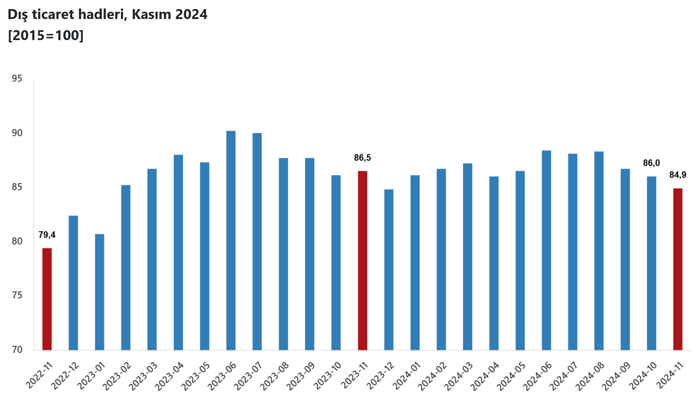 İhracat birim değer endeksinin ithalat birim değer endeksine bölünmesiyle hesaplanan dış ticaret haddi, Kasım 2024'te 1,6 puan düşüşle 84,9 oldu. Türkiye İstatistik Kurumu, geçen yılın kasım ayına ilişkin dış ticaret endekslerini açıkladı. Buna göre, ihracat birim değer endeksi Kasım 2024'te bir önceki yılın aynı ayına kıyasla yüzde 1,3 yükseldi. Endeks, Kasım 2023'e göre gıda, içecek ve tütünde yüzde 12,3, ham maddelerde (yakıt hariç) yüzde 5, imalat sanayisinde (gıda, içecek, tütün hariç) yüzde 0,1 artarken yakıtlarda yüzde 10,1 azaldı. İthalat birim değer endeksi Kasım 2024'te yıllık bazda yüzde 3,3 arttı. Endeks, bir önceki yılın aynı ayına göre gıda, içecek ve tütünde yüzde 6,2, ham maddelerde (yakıt hariç) yüzde 4,6, imalat sanayisinde (gıda, içecek, tütün hariç) yüzde 0,9 artarken yakıtlarda yüzde 1,6 azalış gösterdi. İhracat miktarı azaldı İhracat miktar endeksi Kasım 2024'te bir önceki yılın aynı ayına göre yüzde 4,1 azaldı. Endeks, gıda, içecek ve tütünde yüzde 12, ham maddelerde (yakıt hariç) yüzde 0,7, yakıtlarda yüzde 16,3 gerilerken imalat sanayisinde (gıda, içecek, tütün hariç) yüzde 1,4 artış kaydetti. İthalat miktar endeksi Kasım 2024'te yıllık bazda yüzde 0,4 azaldı. Endeks bu dönemde gıda, içecek ve tütünde yüzde 4,6, imalat sanayisinde (gıda, içecek, tütün hariç) yüzde 0,7 azalırken ham maddelerde (yakıt hariç) yüzde 9,1, yakıtlarda yüzde 10,6 arttı. Mevsim ve takvim etkisinden arındırılmış veriler Mevsim ve takvim etkisinden arındırılmış seriye göre, Ekim 2024'te 146 olan ihracat miktar endeksi yüzde 3,5 artarak aynı yılın kasım ayında 151,2 oldu. Takvim etkisinden arındırılmış seriye göre ise Kasım 2023'te 156,9 olan ihracat miktar endeksi yüzde 0,2 azalışla 156,6 değerini aldı. Mevsim ve takvim etkisinden arındırılmış seriye göre, geçen yılın ekim ayında 125,1 olan ithalat miktar endeksi yüzde 0,9 artışla Kasım 2024'te 126,2 oldu. Takvim etkisinden arındırılmış seriye göre ise Kasım 2023'te 122,1 olan ithalat miktar endeksi yüzde 2,7 artışla geçen yıl kasımda 125,5 olarak kayıtlara geçti. İhracat birim değer endeksinin ithalat birim değer endeksine bölünmesiyle hesaplanan ve Kasım 2023'te 86,5 olan dış ticaret haddi, 1,6 puan düşüşle Kasım 2024'te 84,9 oldu. Kaynak: TÜİK
