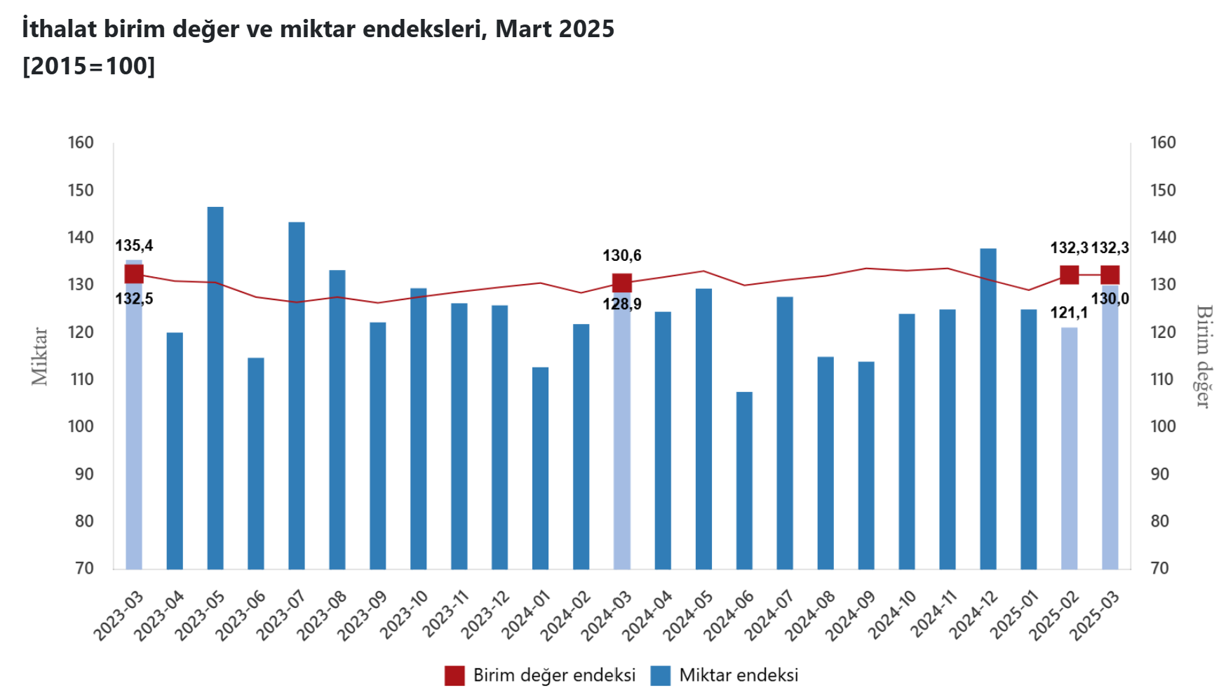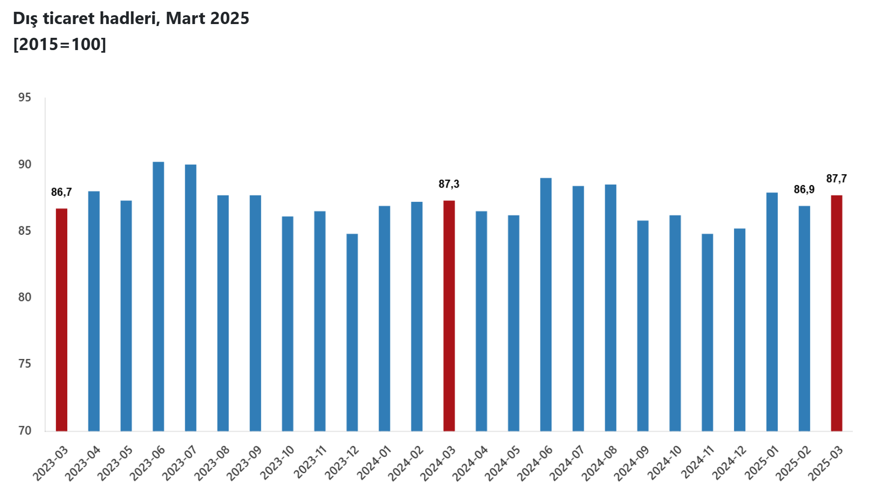 İhracat birim değer endeksinin ithalat birim değer endeksine bölünmesiyle hesaplanan dış ticaret haddi mart ayında 0,4 puan artarak 87,7 oldu. Türkiye İstatistik Kurumu (TÜİK), Mart 2025 dönemine ilişkin Dış Ticaret Endeksleri’ni açıkladı. İhracat birim değer endeksi Mart ayında bir önceki yılın aynı ayına göre %1,8 arttı. Endeks bir önceki yılın aynı ayına göre gıda, içecek ve tütünde %9,3 arttı, ham maddelerde (yakıt hariç) %2,2 arttı, yakıtlarda %15,4 azaldı, imalat sanayinde (gıda, içecek, tütün hariç) %1,6 arttı. İhracat miktar endeksi Mart ayında bir önceki yılın aynı ayına göre %1,5 arttı. Endeks bir önceki yılın aynı ayına göre gıda, içecek ve tütünde %6,3 azaldı, ham maddelerde (yakıt hariç) %4,1 azaldı, yakıtlarda %1,1 azaldı, imalat sanayinde (gıda, içecek, tütün hariç) %2,0 arttı. İthalat birim değer endeksi Mart ayında bir önceki yılın aynı ayına göre %1,3 arttı. Endeks bir önceki yılın aynı ayına göre, gıda, içecek ve tütünde %16,2 arttı, yakıtlarda %1,2 arttı, ham maddelerde (yakıt hariç) %4,3 azaldı, imalat sanayinde (gıda, içecek, tütün hariç) %1,4 azaldı. İthalat miktar endeksi Mart ayında bir önceki yılın aynı ayına göre %0,8 arttı. Endeks bir önceki yılın aynı ayına göre, gıda, içecek ve tütünde %8,0 arttı, ham maddelerde (yakıt hariç) %7,3 azaldı, yakıtlarda %5,1 arttı, imalat sanayinde (gıda, içecek, tütün hariç) %2,7 arttı. Kaynak: TÜİK Mevsim etkisinden arındırılmış veriler Mevsim ve takvim etkilerinden arındırılmış seriye göre ihracat miktar endeksi; 2025 Şubat ayında 153,9 iken 2025 Mart ayında %4,4 oranında artarak 160,6 oldu. Takvim etkilerinden arındırılmış seriye göre ise ihracat miktar endeksi; 2024 yılı Mart ayında 162,0 iken 2025 yılı Mart ayında %5,7 oranında artarak 171,1 oldu. Mevsim ve takvim etkilerinden arındırılmış seriye göre ithalat miktar endeksi; 2025 Şubat ayında 128,0 iken 2025 Mart ayında %2,8 oranında artarak 131,6 oldu. Takvim etkilerinden arındırılmış seriye göre ise ithalat miktar endeksi; 2024 yılı Mart ayında 131,4 iken 2025 yılı Mart ayında %4,0 oranında artarak 136,7 oldu. Dış ticaret haddi arttı İhracat birim değer endeksinin ithalat birim değer endeksine bölünmesiyle hesaplanan ve 2024 yılı Mart ayında 87,3 olarak elde edilmiş olan dış ticaret haddi, 0,4 puan artarak, 2025 yılı Mart ayında 87,7 oldu. Kaynak: TÜİK
