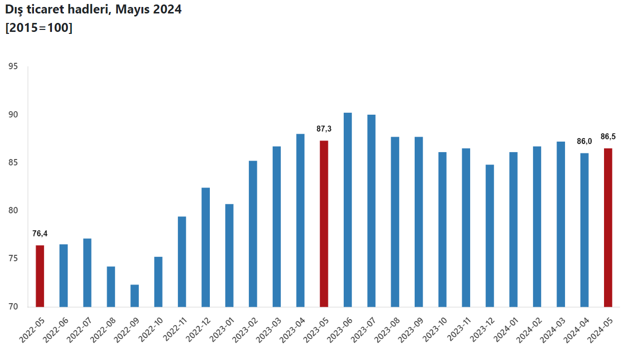 Mayısta ihracat birim değer endeksinin ithalat birim değer endeksine bölünmesiyle hesaplanan ve geçen yıl 87,3 olarak elde edilmiş olan dış ticaret haddi 0,8 puan azalarak 86,5 oldu. Türkiye İstatistik Kurumu (TÜİK), Mayıs 2024 dönemine ilişkin Dış Ticaret Endeksleri’ni açıkladı. İhracat birim değer endeksi mayıs ayında bir önceki yılın aynı ayına göre aynı kaldı. Endeks bir önceki yılın aynı ayına göre gıda, içecek ve tütünde yüzde 2,7 arttı, ham maddelerde (yakıt hariç) yüzde 4,7 azaldı, yakıtlarda yüzde 11,3 arttı, imalat sanayinde (gıda, içecek, tütün hariç) yüzde 1,4 azaldı. İthalat miktarı arttı İhracat miktar endeksi mayıs ayında bir önceki yılın aynı ayına göre yüzde 11,3 arttı. Endeks bir önceki yılın aynı ayına göre gıda, içecek ve tütünde yüzde 11,6 arttı, ham maddelerde (yakıt hariç) yüzde 10,6 arttı, yakıtlarda yüzde 13,3 arttı, imalat sanayinde (gıda, içecek, tütün hariç) yüzde 10,3 arttı. Mevsim ve takvim etkilerinden arındırılmış seriye göre ihracat miktar endeksi; 2024 Nisan ayında 150,3 iken 2024 Mayıs ayında yüzde 5,7 oranında artarak 158,9 oldu. Takvim etkilerinden arındırılmış seriye göre ise ihracat miktar endeksi; 2023 yılı mayıs ayında 142,6 iken 2024 yılı mayıs ayında yüzde 11,3 oranında artarak 158,6 oldu. İthalat miktarı azaldı İthalat birim değer endeksi mayıs ayında bir önceki yılın aynı ayına göre yüzde 1,0 arttı. Endeks bir önceki yılın aynı ayına göre, gıda, içecek ve tütünde yüzde 3,9 azaldı, yakıtlarda yüzde 4,7 arttı, ham maddelerde (yakıt hariç) yüzde 4,7 azaldı, imalat sanayinde (gıda, içecek, tütün hariç) yüzde 0,2 azaldı. İthalat miktar endeksi mayıs ayında bir önceki yılın aynı ayına göre yüzde 11,2 azaldı. Endeks bir önceki yılın aynı ayına göre, gıda, içecek ve tütünde yüzde 20,3 azaldı, ham maddelerde (yakıt hariç) yüzde 7,1 azaldı, yakıtlarda yüzde 5,9 azaldı, imalat sanayinde (gıda, içecek, tütün hariç) yüzde 5,9 azaldı. Mevsim ve takvim etkilerinden arındırılmış seriye göre ithalat miktar endeksi; 2024 Nisan ayında 135,7 iken 2024 Mayıs ayında yüzde 13,0 oranında azalarak 118,1 oldu. Takvim etkilerinden arındırılmış seriye göre ise ithalat miktar endeksi; 2023 yılı mayıs ayında 143,2 iken 2024 yılı mayıs ayında yüzde 14,0 oranında azalarak 123,2 oldu. Dış ticaret haddi İhracat birim değer endeksinin ithalat birim değer endeksine bölünmesiyle hesaplanan ve 2023 yılı Mayıs ayında 87,3 olarak elde edilmiş olan dış ticaret haddi, 0,8 puan azalarak, 2024 yılı Mayıs ayında 86,5 oldu. Kaynak: TÜİK