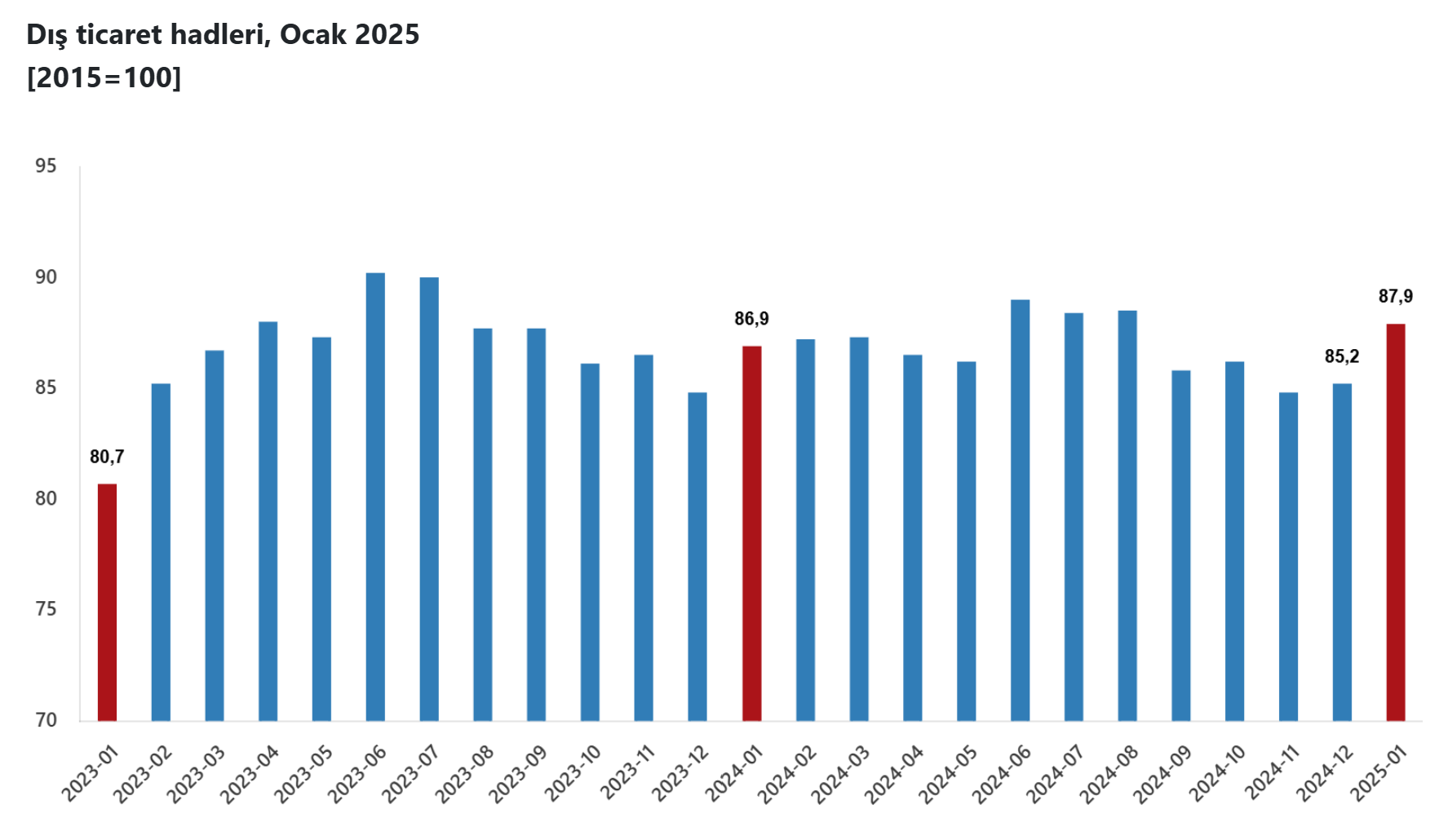 TÜİK verilerine göre ihracat birim değer endeksinin ithalat birim değer endeksine bölünmesiyle hesaplanan ve geçen yılın aynı ayında 86,9 olan dış ticaret haddi, 1 puan artarak 87,9 olarak kayıtlara geçti. Türkiye İstatistik Kurumu (TÜİK), ocak ayına ilişkin dış ticaret endekslerini açıkladı. Buna göre, ihracat birim değer endeksi, ocakta geçen yılın aynı ayına kıyasla değişim göstermedi. Endeks, Ocak 2024'e göre gıda, içecek ve tütünde yüzde 5,5, ham maddelerde (yakıt hariç) 0,2 artarken, imalat sanayisinde (gıda, içecek, tütün hariç) yüzde 1, yakıtlarda yüzde 5,1 azalış gösterdi. İthalat birim değer endeksi, ocakta yıllık bazda yüzde 1,1 azaldı. Endeks, geçen yılın aynı ayına göre, gıda, içecek ve tütünde yüzde 6,8 artarken, yakıtlarda aynı kaldı. Ham maddelerde (yakıt hariç) yüzde 1,4, imalat sanayisinde (gıda, içecek, tütün hariç) yüzde 5 düşüş gösterdi. Miktar endeksleri İhracat miktar endeksi, ocakta geçen yılın aynı ayına kıyasla yüzde 5,8 artış kaydetti. Endeks, bu dönemde gıda, içecek ve tütünde yüzde 9,4, ham maddelerde (yakıt hariç) yüzde 5 azalırken, yakıtlarda aynı kaldı. İmalat sanayisinde (gıda, içecek, tütün hariç) ise yüzde 8,2 artış gösterdi. İthalat miktar endeksi ise ocakta yıllık bazda yüzde 10,8 arttı. Endeks, geçen yılın aynı ayına göre, gıda, içecek ve tütünde yüzde 21, imalat sanayisinde (gıda, içecek, tütün hariç) yüzde 17,4, ham maddelerde (yakıt hariç) yüzde 3,3 artış kaydederken, yakıtlarda yüzde 2 geriledi. Mevsim ve takvim etkisinden arındırılmış veriler Mevsim ve takvim etkisinden arındırılmış seriye göre, Aralık 2024'te 155,2 olan ihracat miktar endeksi, ocakta yüzde 1,9 artışla 158,2 olarak hesaplandı. Takvim etkisinden arındırılmış seriye göre ise geçen yıl ocakta 132,7 olan ihracat miktar endeksi yüzde 5,8 artarak 140,4 oldu. Mevsim ve takvim etkisinden arındırılmış seriye göre, Aralık 2024'te 127,6 olan ithalat miktar endeksi yüzde 0,8 artarak ocakta 128,7 olarak kayıtlara geçti. Takvim etkisinden arındırılmış seriye göre ise geçen yıl ocakta 109 olan endeks yüzde 10,8 artarak bu yılın aynı ayında 120,9 oldu. İhracat birim değer endeksinin ithalat birim değer endeksine bölünmesiyle hesaplanan ve geçen yılın aynı ayında 86,9 olan dış ticaret haddi, 1 puan artarak bu yılın aynı ayında 87,9 olarak kayıtlara geçti. Kaynak: TÜİK