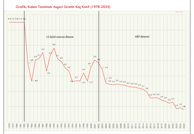 DİSK-AR’ın hazırladığı son rapora göre AKP iktidarı döneminde kıdem tazminatının asgari ücrete oranı hızla geriledi. DİSK-AR araştırmacısı Prof. Dr. Aziz Çelik ise kıdem tazminatı tavanındaki düşüş sonrası işçi emeklisinin ev alma hayalinin sona erdiğini söyledi. Türkiye Devrimci İşçi Sendikaları Konfederasyonu Araştırma Merkezi (DİSK-AR), 1978 - 2025 yılları arasında kıdem tazminatının asgari ücret karşısındaki artışını paylaştı. Devrimci İşçi Sendikaları Konfederasyonu Araştırma Merkezi (DİSK-AR) verilerine göre, AKP öncesinde asgari ücretin 4,8 katı olan kıdem tazminatı tavanı, Ocak 2025 itibarıyla asgari ücretin sadece 1,8 katına geriledi. Konuya ilişkin raporda, “1978’de asgari ücretin 7,5 katı olan kıdem tazminatı tavanı, 1982’de asgari ücret ile bağının koparılmasının ardından hızla düşmeye başladı. AKP’nin iktidara geldiği 2002 yılında kıdem tazminatı asgari ücretin 4,8 katıydı. AKP döneminde kıdem tazminatının asgari ücrete oranı 12 Eylül döneminin de gerisine düştü” tespitine yer verildi. Kaynak: DİSK-AR Yayınlanan raporda, “2025 yılı Ocak-Haziran dönemi kıdem tazminatı tavanı 46 bin 655,43 TL olarak açıklandı. Haziran-Aralık 2024 döneminde 41 bin 828,42 TL olan kıdem tazminatı tavanı yüzde sadece 11,54 oranında artmış oldu. Oysa kıdem tazminatına esas olması gereken Haziran-Aralık 2024 dönemi enflasyonu yüzde 15,75 olarak açıklandı. Ancak kıdem tazminatı tavanı memur maaş artışlarına endekslendiği için artış memur maaş artışlarına paralel olarak yüzde 11,54 düzeyinde kaldı” denildi. Kaynak: DİSK-AR "İşçi emeklisinin ev alma hayali sona erdi" DİSK-AR araştırmacısı Prof. Dr. Aziz Çelik ise rapora ilişkin sosyal medya hesabından şunları söyledi: “Kıdem tazminatını yok ettiler! 12 Eylül öncesinde asgari ücretin 7,5 katı olan kıdem tazminatı tavanı, 12 Eylül sonrası asgari ücretin 3,7 katına düşmüştü. AKP döneminde ise kıdem tazminatı tavanı asgari ücretin 4,8 katıydı. 22 yıllık AKP iktidarı sonrasında Ocak 2025'te kıdem tazminatı tavanı asgari ücretin 1,8 katına düştü! Artık işçi emeklilerinin kıdem tazminatıyla ev sahibi olma hayali sona erdi!" [news_id:758575]