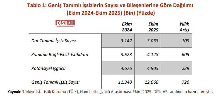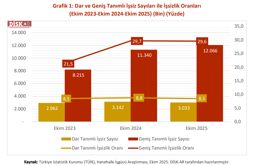 DİSK-AR'ın Kasım ayı İşsizlik Raporu'na göre geniş tanımlı işsizlik son yılda 726 bin kişi artarak 12 milyon 66 bin seviyesine çıktı. Türkiye Devrimci İşçi Sendikaları Konfederasyonu Araştırma Merkezi (DİSK-AR), TÜİK verilerini baz alarak hazırladığı Kasım 2025 tarihli İşsizliğin Görünümü Raporu'nu kamuoyuyla paylaştı. Rapora göre mevsim etkisinden arındırılmış geniş tanımlı işsizlik oranı yüzde 29,6 seviyesine yükselirken, geniş tanımlı işsiz sayısı 12 milyon sınırını aşarak 12 milyon 66 bin kişi olarak gerçekleşti. Raporda geniş tanımlı işsiz sayısının son iki yılda 3,9 milyon, son bir yılda ise 726 bin kişi arttığı belirtildi. Zamana bağlı eksik istihdam ve potansiyel işgücü artış gösterdi Geniş tanımlı işsizlikteki artışın temel sebepleri arasında zamana bağlı eksik istihdam (Kısmi Çalışma) ve potansiyel işgücü sayısındaki yükseliş yer aldı. Raporda zamana bağlı eksik istihdam edilenlerin sayısının son bir yılda 605 bin kişi artarak 4 milyon 128 bine ulaştığı belirtildi. Benzer şekilde, iş aramayıp çalışmaya hazır olanları da kapsayan potansiyel işgücü sayısı son bir yılda 229 bin kişi artışla 4 milyon 905 bin kişiye yükseldi. [news_id:793412]