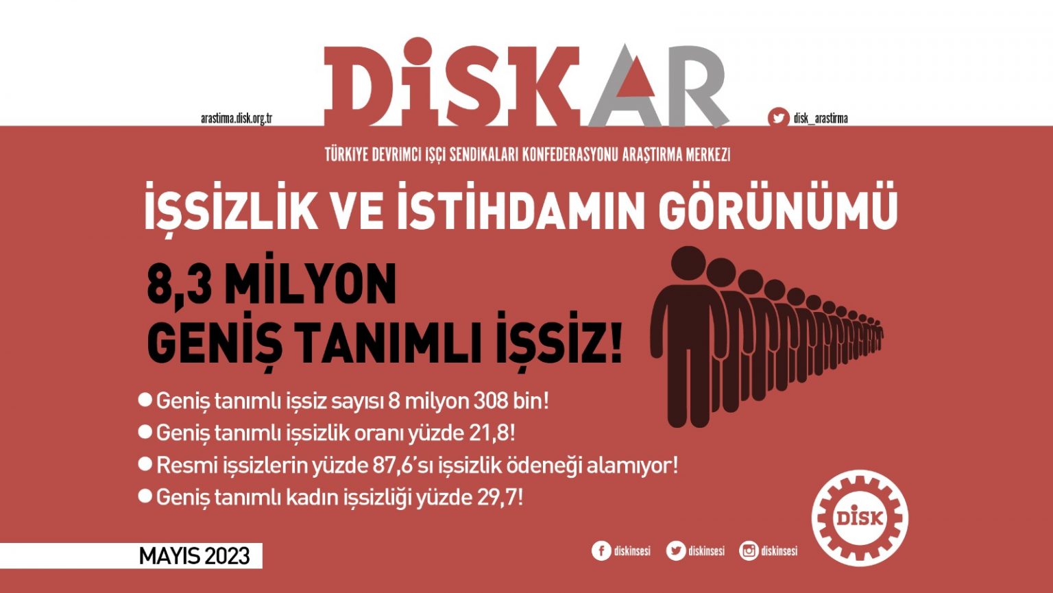 DİSK-AR’ın raporuna göre, Mart 2023’de geniş tanımlı işsiz sayısı 8 milyon 308 bin, geniş tanımlı işsizlik oranı ise yüzde 21,8 oldu. Raporda ayrıca resmi işsizlerin yüzde 87,6’sının işsizlik ödeneği alamadığı bildirildi. DİSK-AR, "İşsizlik ve İstihdamın Görünümü (Mayıs 2023)" raporunu yayımladı. TÜİK, mart ayı işsizlik oranını yüzde 10 olarak açıklamıştı. DİSK-AR’a göre ise aynı dönemde geniş tanımlı işsizlik oranı yüzde 21,8 oldu. DİSK-AR tarafından TÜİK verilerinden yararlanarak yapılan hesaplamaya göre mevsim etkisinden arındırılmış geniş tanımlı işsiz sayısı ise Mart 2023’te 8 milyon 308 bin kişi olarak gerçekleşti. TÜİK’e göre 2019 Mart’ta yüzde 13,9 olan dar tanımlı işsizlik, Mart 2023’te yüzde 10 olarak gerçekleşti. Ancak aynı yıllarda geniş tanımlı işsizlik yüzde 19,6’dan yüzde 21,8’e yükseldi. “Büyük çoğunluk işsizlik ödeneğinden yararlanamıyor” DİSK-AR’ın raporunda, işsizlik ödeneğinden yararlanma koşullarının ağır olması ve işsizlik sigortası kaynaklarının amacı dışında kullanılması sebebiyle işsizlerin büyük çoğunluğunun işsizlik ödeneğinden yararlanamadığı da belirtildi. Raporda ayrıca Mart 2023’te TÜİK toplam dar tanımlı işsiz sayısının 3 milyon 508 bin kişi olarak açıkladığı ve İŞKUR’un Mart 2023 verilerine göre ise bu ayda işsizlik ödeneği alabilenlerin sayısının 435 binde kaldığı bildirildi. Böylece Mart 2023’te resmi işsizlerin sadece yüzde 12,4’ü işsizlik ödeneği alabildiği; 3,5 milyonu aşkın işsizin ise işsizlik ödeneği alamadığı paylaşıldı. Bu da işsizlerin yaklaşık yüzde 87,6’sının işsizlik ödeneği alamadığı anlamına geldi. Kaynak: DİSK-AR