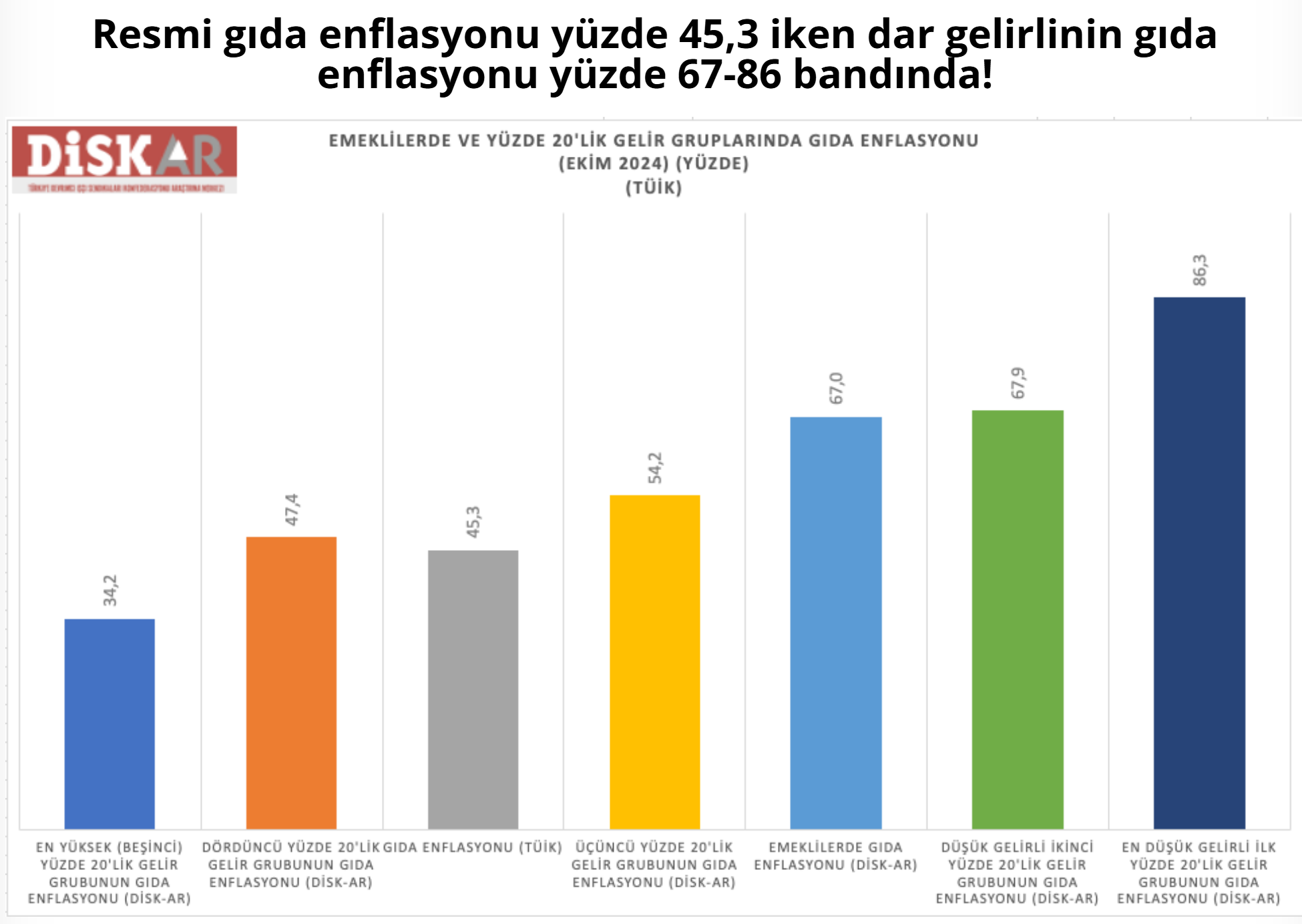 TÜİK’in enflasyon verilerini açıklamasının ardından enflasyon hedefinin tutmadığına vurgu yapan DİSK-AR, gelir düzeylerine göre hissedilen enflasyon verilerini hesapladı. Devrimci İşçi Sendikaları Konfederasyonu (DİSK), Türkiye İstatistik Kurumu (TÜİK) resmi enflasyon verilerini yorumladı. Ekim ayında TÜİK’in açıkladığı enflasyon aylık yüzde 2,88, yıllık yüzde 48,58 olurken, gıda enflasyonuna vurgu yapıldı. DİSK’in açıklamasında “Enflasyon hedefi tutmuyor!” denilirken, “TÜİK’e göre yıllık resmi enflasyon yüzde 48,5 oldu. Ekim 2024’te gıda fiyatları artışı 4,33 oldu. Resmi gıda enflasyonu yüzde 45,3 iken dar gelirlinin gıda enflasyonu 86,3. Hükümetin yüzde 41,5’lik 2024 yıllık enflasyon hedefi tutmayacak” ifadeleri kullanıldı. “Toplumsal sınıf ve kesimlerin arasındaki enflasyon farkı çok büyük” denilen hesaplamada, resmi verilere göre 2003’ten bu yana ortalama fiyatların 21 kat arttığı, gıda fiyatlarının ise 32 kat arttığına dikkat çekildi. Gıda enflasyonu resmi yüzde 45,3, dar gelirlinin yüzde 67-86 TÜİK’in yargı kararına rağmen yine madde fiyat listesini yine açıklamadığına vurgu yapılan DİSK verilerinde, şu ifadeler kullanıldı: “2024 Ekim dönemine ait TÜİK Tüketici Fiyat Endeksi (TÜFE) 4 Kasım 2024’te yayımlandı. TÜİK verilerine göre TÜFE’deki değişim 2024 Ekim’de bir önceki aya göre yüzde 2,88 ve bir önceki yılın aynı ayına göre yüzde 48,5 oldu. 2024 yılının ilk on ayında ortalama fiyat artış oranı ise yüzde 39,8 olarak gerçekleşti 2024 Ekim döneminde en yüksek fiyat artışı yıllık yüzde 93,6 ile eğitim oldu. İkinci en yüksek fiyat artışının görüldüğü harcama grubu yıllık yüzde 89,3 artışla konut olurken üçüncü harcama grubu ise yüzde 62 ile lokanta ve oteller oldu. 2024 Ekim döneminde en yüksek fiyat aylık artış yüzde 14,3 giyim ve ayakkabı da olurken, ikinci en yüksek artış yüzde 4,33 ile gıdada gerçekleşti. Resmi gıda enflasyonu yüzde 45,3 iken dar gelirlinin gıda enflasyonu yüzde 67-86 bandında.'' Zenginin ve yoksulun enflasyon farkı DİSK-AR’ın TÜİK verilerinden yararlanarak yaptığı hesaplamaya göre emeklilerde gıda enflasyonu yüzde 67 oldu. Üçüncü yüzde 20’lik gelir grubunun gıda enflasyonu yüzde 54,2 olurken, düşük gelirli ikinci yüzde 20’lik grubun gıda enflasyonu yüzde 67,9 ve en yoksul yüzde 20’lik gelir grubun gıda enflasyonu ise yüzde 86,3 olarak gerçekleşti. Yüksek gelir gruplarının daha düşük gıda enflasyonu hissettiği görülüyor. Dördüncü (yüksek) yüzde 20’lik gelir grubunun gıda enflasyonu yüzde 47,4 olurken, en yüksek gelir grubunun gıda enflasyonu ise yüzde 34,2 oldu. Böylece en yoksul gelir grubunun gıda enflasyonu yüzde 86 olurken, en yüksek gelir grubunun gıda enflasyonu yüzde 34 düzeyinde kaldı. Kaynak: DİSK-AR [news_id:748739]