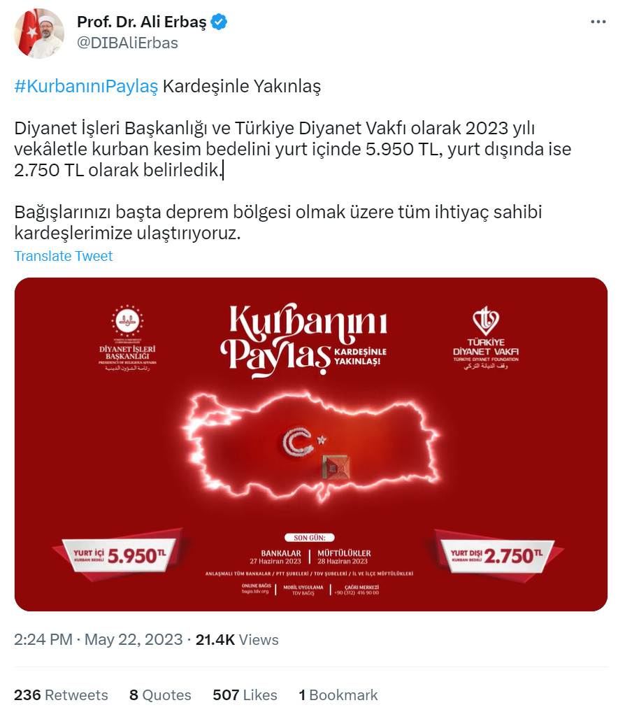 Diyanet İşleri Başkanı Ali Erbaş, 2023 yılına yönelik vekaletle yurt içi ve yurt dışı kurban kesim bedellerini açıkladı. 2023 Kurban Bayramı'na sayılı gün kala, dini vazifelerini yerine getirecek olan vatandaşlar için kurban kesim bedeli belli oldu. Buna göre, Diyanet İşleri Başkanı Prof. Dr. Ali Erbaş, Türkiye Diyanet Vakfı'nın 2023 yılı vekaletle kurban kesim bedelini yurt içinde 5 bin 950, yurt dışında ise 2 bin 750 TL olarak belirlediklerini açıkladı. Diyanet İşleri Başkanı Erbaş’ın konuyla ilgili açıklaması şöyle: "Diyanet İşleri Başkanlığı ve Türkiye Diyanet Vakfı olarak 2023 yılı vekaletle kurban kesim bedelini yurt içinde 5 bin 950 TL, yurt dışında ise 2 bin 750 TL olarak belirledik. Bağışlarınızı başta deprem bölgesi olmak üzere tüm ihtiyaç sahibi kardeşlerimize ulaştırıyoruz" Kaynak: Ali Erbaş - Twitter