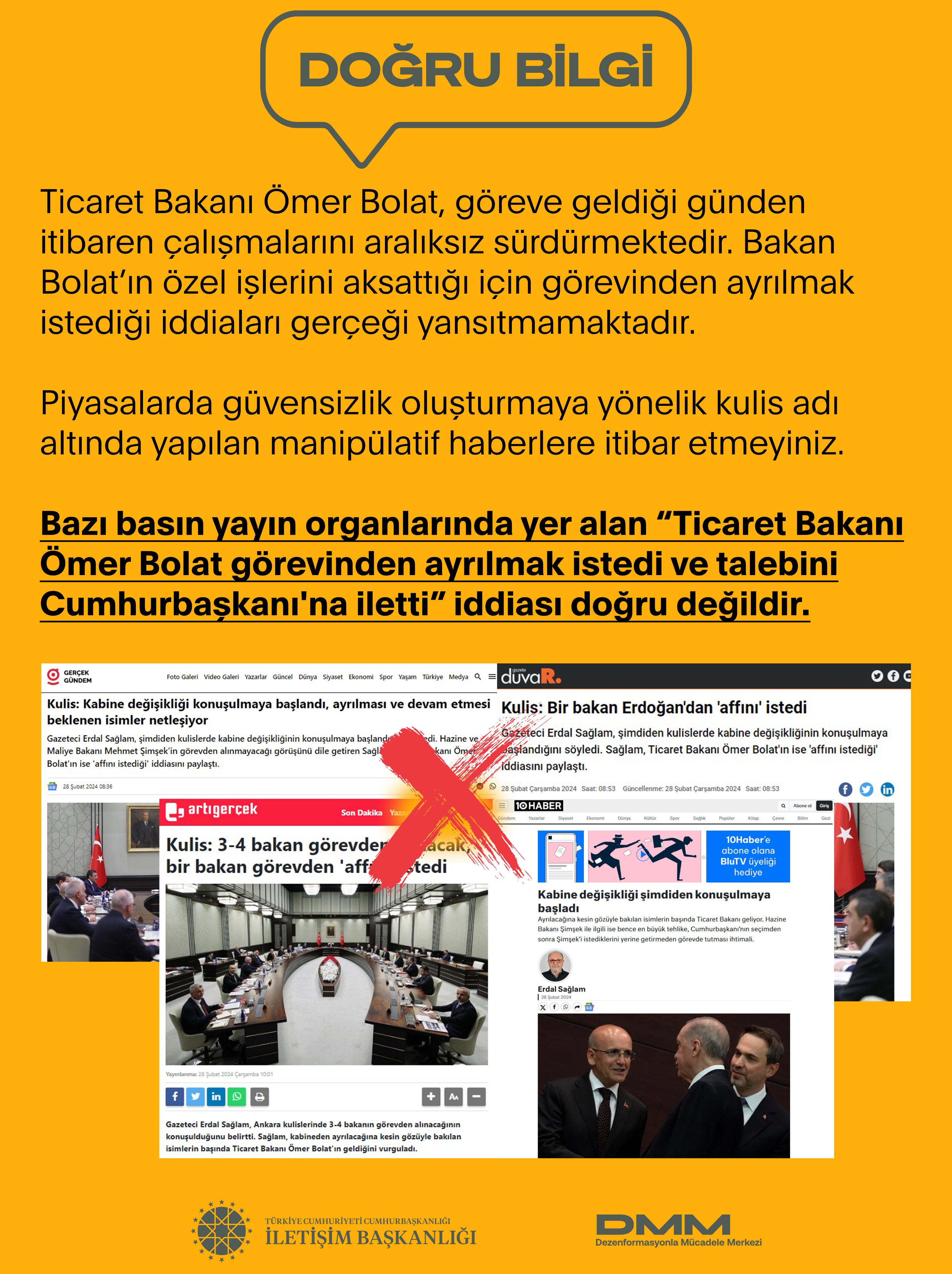 Cumhurbaşkanlığı İletişim Başkanlığı Dezenformasyonla Mücadele Merkezi (DMM) "Ticaret Bakanı Ömer Bolat görevinden ayrılmak istedi ve talebini Cumhurbaşkanı Recep Tayyip Erdoğan'a iletti" iddiasının doğru olmadığını bildirdi. İletişim Başkanlığı, Ticaret Bakanı Bolat'ın görevinden ayrılmak istediği iddiasını yalanladı DMM'nin sosyal medya hesabından yapılan paylaşımda, "Ticaret Bakanı Ömer Bolat, göreve geldiği günden itibaren çalışmalarını aralıksız sürdürmektedir. Bakan Bolat'ın özel işlerini aksattığı için görevinden ayrılmak istediği iddiaları gerçeği yansıtmamaktadır. Piyasalarda güvensizlik oluşturmaya yönelik kulis adı altında yapılan manipülatif haberlere itibar etmeyiniz." ifadelerine yer verildi. Kaynak: DMM - X