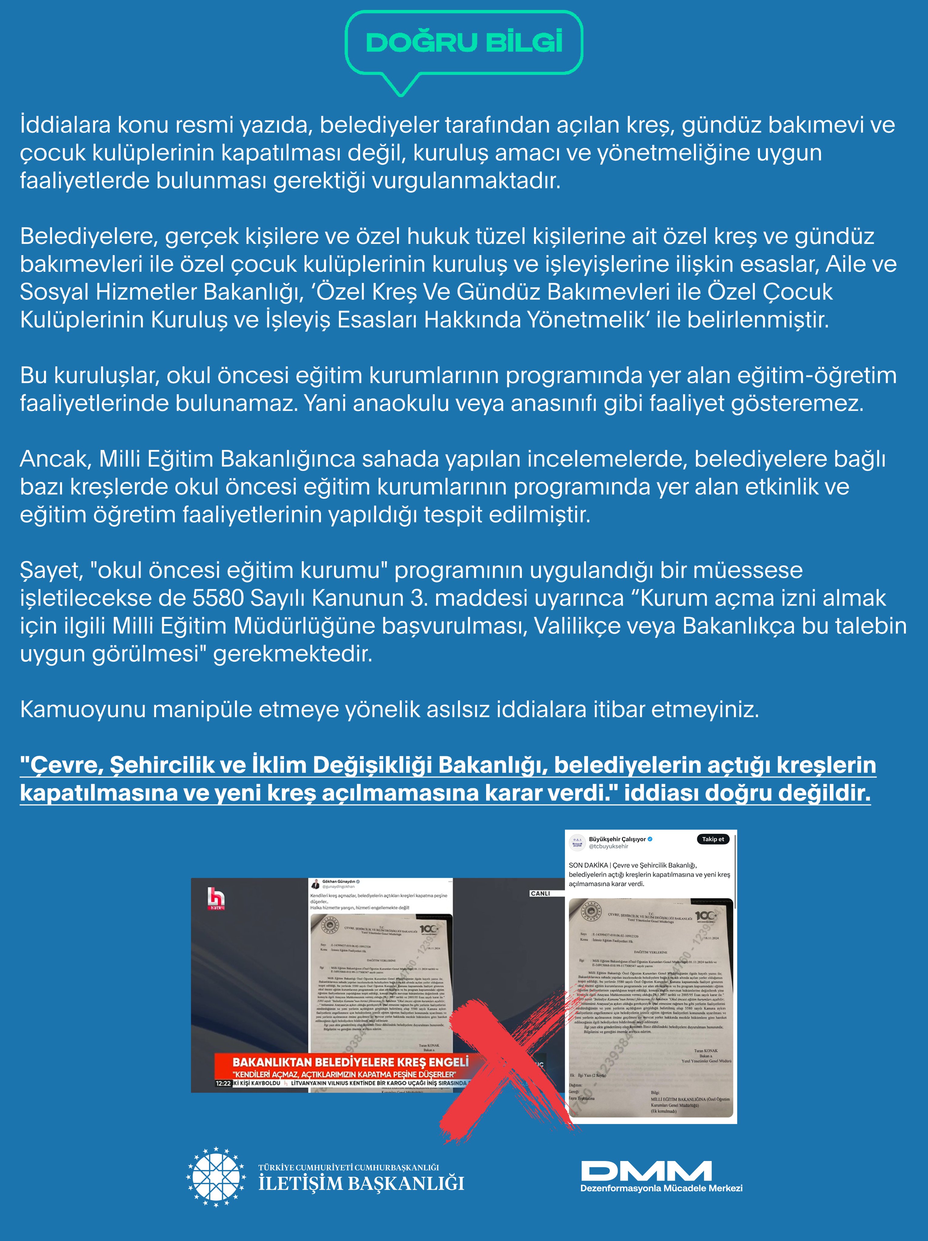 Dezenformasyonla Mücadele Merkezi, bazı basın yayın organlarında yer alan, Çevre, Şehircilik ve İklim Değişikliği Bakanlığının belediyelerin açtığı kreşlerin kapatılmasına ve yeni kreş açılmamasına dair karar verdiği ve konu hakkında resmi yazı gönderdiği iddialarını yalanladı. Cumhurbaşkanlığı İletişim Başkanlığı Dezenformasyonla Mücadele Merkezi, "Çevre, Şehircilik ve İklim Değişikliği Bakanlığı, belediyelerin açtığı kreşlerin kapatılmasına ve yeni kreş açılmamasına karar verdi." iddiasının doğru olmadığını bildirdi. Açıklamada, "İddialara konu resmi yazıda, belediyeler tarafından açılan kreş, gündüz bakımevi ve çocuk kulüplerinin kapatılması değil, kuruluş amacı ve yönetmeliğine uygun faaliyetlerde bulunması gerektiği vurgulanmaktadır." denildi. Dezenformasyonla Mücadele Merkezinden yapılan açıklamada, şu ifadelere yer verildi: "Çevre, Şehircilik ve İklim Değişikliği Bakanlığı, belediyelerin açtığı kreşlerin kapatılmasına ve yeni kreş açılmamasına karar verdi." iddiası doğru değildir. İddialara konu resmi yazıda, belediyeler tarafından açılan kreş, gündüz bakımevi ve çocuk kulüplerinin kapatılması değil, kuruluş amacı ve yönetmeliğine uygun faaliyetlerde bulunması gerektiği vurgulanmaktadır. Belediyelere, gerçek kişilere ve özel hukuk tüzel kişilerine ait özel kreş ve gündüz bakımevleri ile özel çocuk kulüplerinin kuruluş ve işleyişlerine ilişkin esaslar, Aile ve Sosyal Hizmetler Bakanlığı, ‘Özel Kreş Ve Gündüz Bakımevleri ile Özel Çocuk Kulüplerinin Kuruluş ve İşleyiş Esasları Hakkında Yönetmelik’ ile belirlenmiştir. Bu kuruluşlar, okul öncesi eğitim kurumlarının programında yer alan eğitim-öğretim faaliyetlerinde bulunamaz. Yani anaokulu veya anasınıfı gibi faaliyet gösteremez. Ancak, Milli Eğitim Bakanlığınca sahada yapılan incelemelerde, belediyelere bağlı bazı kreşlerde okul öncesi eğitim kurumlarının programında yer alan etkinlik ve eğitim öğretim faaliyetlerinin yapıldığı tespit edilmiştir. Şayet, "okul öncesi eğitim kurumu" programının uygulandığı bir müessese işletilecekse de 5580 Sayılı Kanunun 3. maddesi uyarınca “Kurum açma izni almak için ilgili Milli Eğitim Müdürlüğüne başvurulması, Valilikçe veya Bakanlıkça bu talebin uygun görülmesi" gerekmektedir." Kaynak: DMM