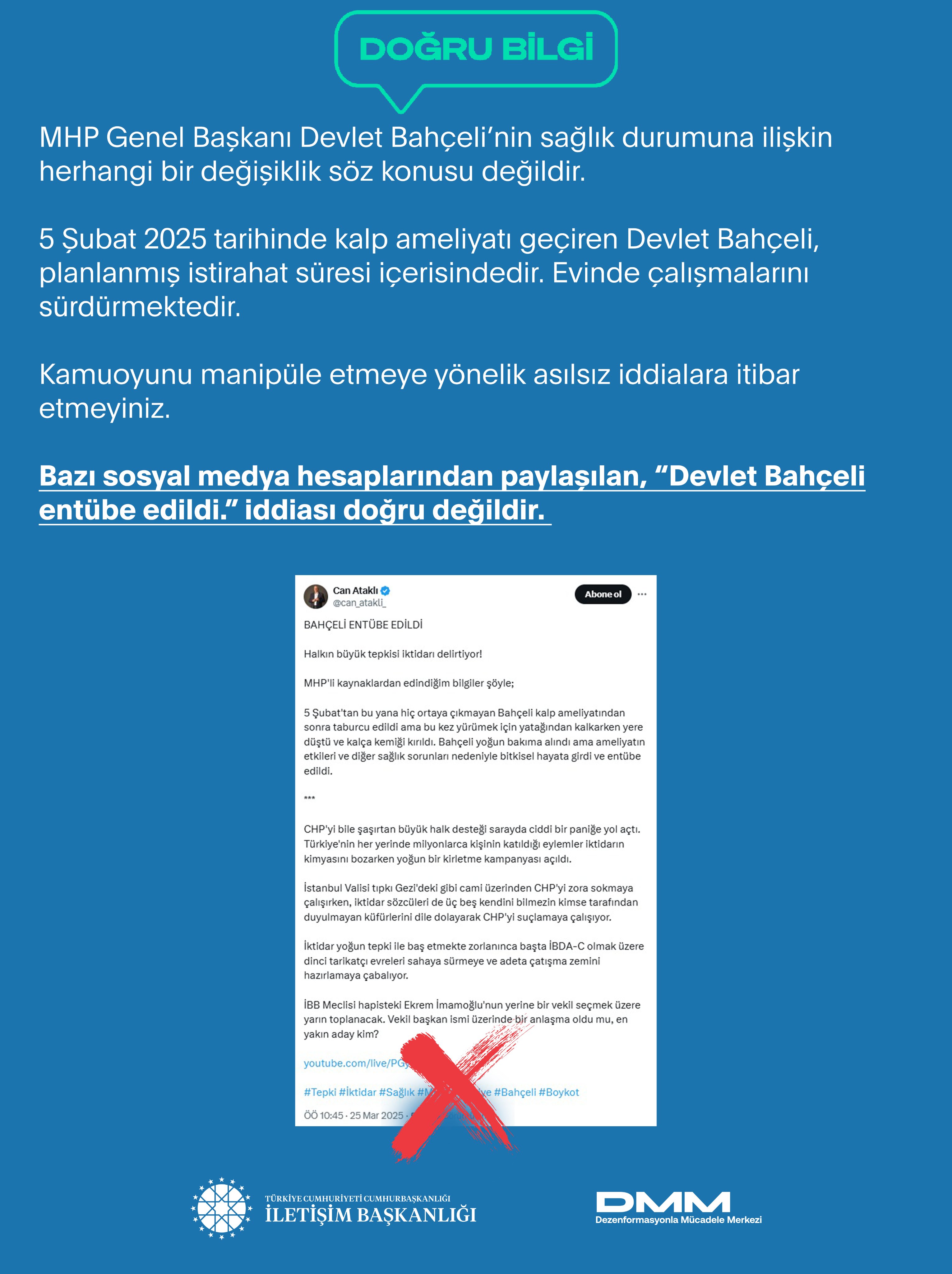 Dezenformasyonla Mücadele Merkezi, sosyal medya hesabından yaptığı paylaşımda, “Devlet Bahçeli entübe edildi” iddiasının dezenformasyon içerdiğini bildirdi. DMM, bazı sosyal medya hesaplarından paylaşılan, “Devlet Bahçeli entübe edildi” iddiasının doğru olmadığını açıkladı. Konuya ilişkin açıklamada şunlar kaydedildi: "Bazı sosyal medya hesaplarından paylaşılan, “Devlet Bahçeli entübe edildi.” iddiası doğru değildir. MHP Genel Başkanı Devlet Bahçeli’nin sağlık durumuna ilişkin herhangi bir değişiklik söz konusu değildir. 5 Şubat 2025 tarihinde kalp ameliyatı geçiren Devlet Bahçeli, planlanmış istirahat süresi içerisindedir. Evinde çalışmalarını sürdürmektedir. Kamuoyunu manipüle etmeye yönelik asılsız iddialara itibar etmeyiniz." Kaynak: DMM