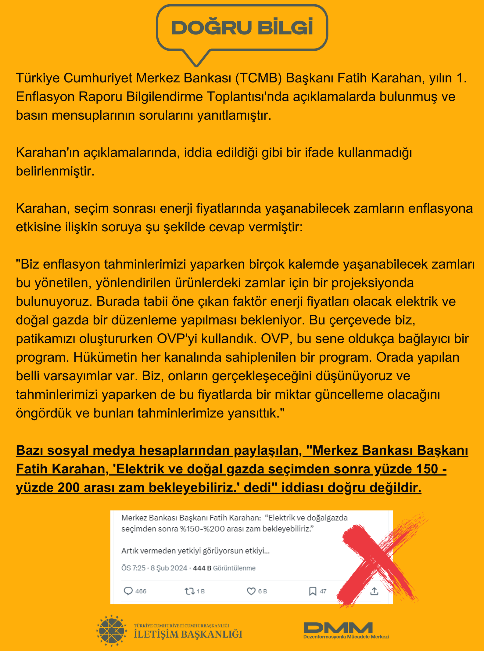 Dezenformasyonla Mücadele Merkezi (DMM), bazı sosyal medya hesaplarından paylaşılan, "Merkez Bankası Başkanı Fatih Karahan, 'Elektrik ve doğal gazda seçimden sonra yüzde 150 - yüzde 200 arası zam bekleyebiliriz.' dedi" iddiasını yalanladı. DMM tarafından yapılan açıklamada şöyle denildi: "Türkiye Cumhuriyet Merkez Bankası (TCMB) Başkanı Fatih Karahan, yılın 1. Enflasyon Raporu Bilgilendirme Toplantısı'nda açıklamalarda bulunmuş ve basın mensuplarının sorularını yanıtlamıştır. Karahan'ın açıklamalarında, iddia edildiği gibi bir ifade kullanmadığı belirlenmiştir. Karahan, seçim sonrası enerji fiyatlarında yaşanabilecek zamların enflasyona etkisine ilişkin soruya şu şekilde cevap vermiştir: "Biz enflasyon tahminlerimizi yaparken birçok kalemde yaşanabilecek zamları bu yönetilen, yönlendirilen ürünlerdeki zamlar için bir projeksiyonda bulunuyoruz. Burada tabii öne çıkan faktör enerji fiyatları olacak elektrik ve doğal gazda bir düzenleme yapılması bekleniyor. Bu çerçevede biz, patikamızı oluştururken OVP'yi kullandık. OVP, bu sene oldukça bağlayıcı bir program. Hükümetin her kanalında sahiplenilen bir program. Orada yapılan belli varsayımlar var. Biz, onların gerçekleşeceğini düşünüyoruz ve tahminlerimizi yaparken de bu fiyatlarda bir miktar güncelleme olacağını öngördük ve bunları tahminlerimize yansıttık."" Kaynak: DMM - X
