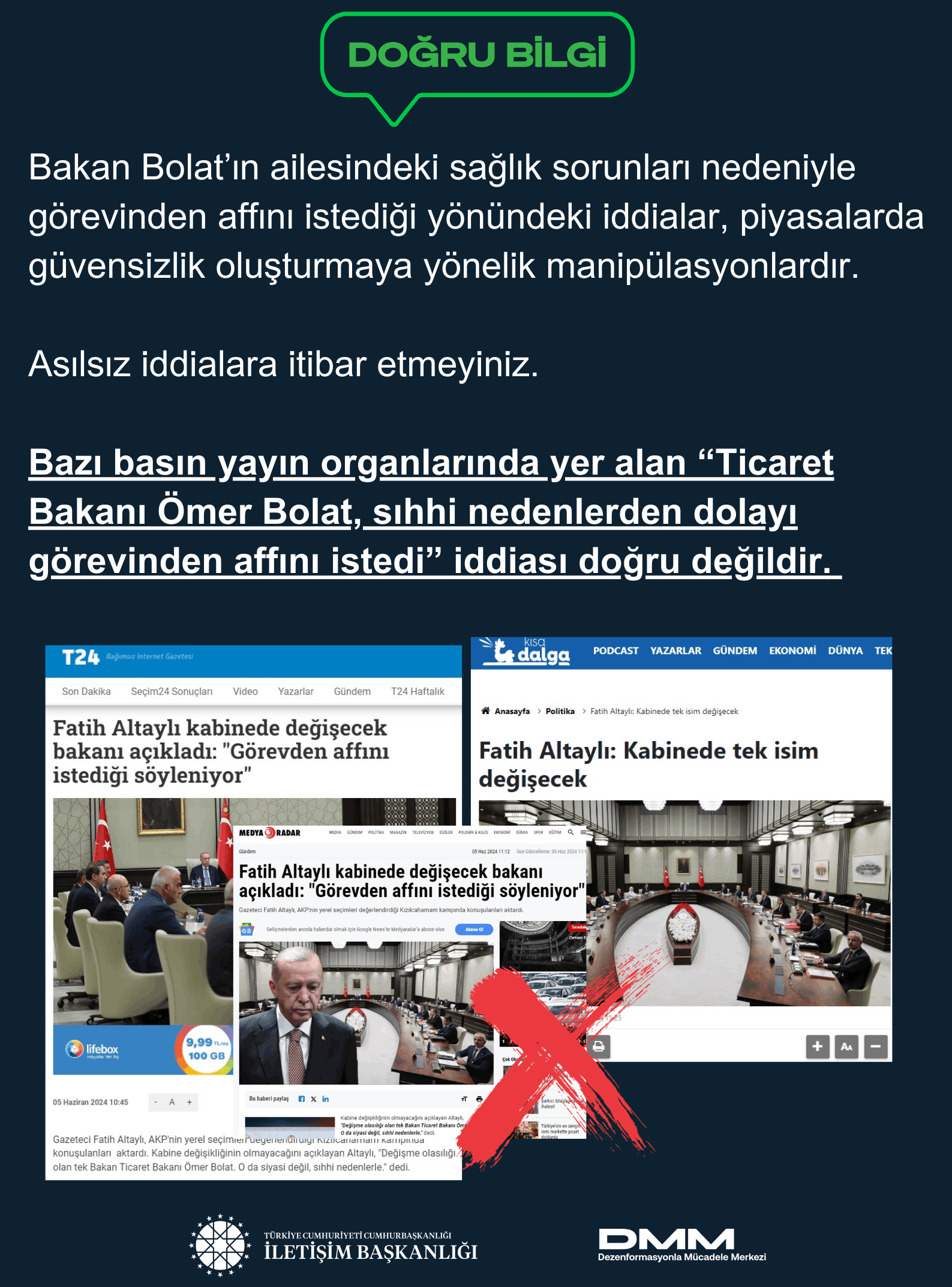 Ticaret Bakanı Ömer Bolat'ın görevden affını istediğine yönelik haberlerin ardından İletişim Başkanlığı tarafından açıklama yapıldı. Cumhurbaşkanlığı İletişim Başkanlığı Dezenformasyonla Mücadele Merkezi (DMM), Ticaret Bakanı Ömer Bolat'ın, ailesindeki sağlık sorunları nedeniyle görevinden affını istediğine ilişkin iddiaların asılsız olduğunu bildirdi. DMM'nin sosyal medya hesabından yapılan açıklamada, "Bakan Bolat'ın ailesindeki sağlık sorunları nedeniyle görevinden affını istediği yönündeki iddialar, piyasalarda güvensizlik oluşturmaya yönelik manipülasyonlardır. Asılsız iddialara itibar etmeyiniz." ifadelerine yer verildi. Kaynak: DMM - X Ne olmuştu? AKP'nin yerel seçimleri değerlendirdiği Kızılcahamam kampında konuşulanlarla ilgili paylaşımda bulunan kaynaklar, Kabine değişikliğinin olmayacağını öne sürerek, "Değişme olasılığı olan tek bakan, Ticaret Bakanı Ömer Bolat. O da siyasi değil, sıhhi nedenlerle." demişti. [news_id:735594]