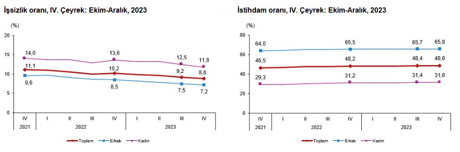 Mevsim etkisinden arındırılmış işsizlik oranı 2023 yılının son çeyreğinde %8,8 seviyesinde gerçekleşti. Türkiye İstatistik Kurumu (TÜİK), 2023 yılı 4. çeyrek işsizlik rakamlarını açıkladı. Buna göre hanehalkı iş gücü araştırması sonuçlarına göre 15 ve daha yukarı yaştaki kişilerde işsiz sayısı 2023 yılı IV. çeyreğinde bir önceki çeyreğe göre 137 bin kişi azalarak 3 milyon 70 bin kişi oldu. İşsizlik oranı ise 0,4 puanlık azalış ile %8,8 seviyesinde gerçekleşti. İşsizlik oranı erkeklerde %7,2, kadınlarda %11,8 olarak tahmin edildi. Kaynak: TÜİK Mevsim etkisinden arındırılmış istihdam oranı %48,6 oldu İstihdam edilenlerin sayısı 2023 yılı IV. çeyreğinde bir önceki çeyreğe göre 195 bin kişi artarak 31 milyon 867 bin kişi, istihdam oranı ise 0,2 puanlık artış ile %48,6 oldu. Bu oran erkeklerde %65,8 iken kadınlarda %31,6 olarak gerçekleşti. Mevsim etkisinden arındırılmış iş gücüne katılma oranı %53,2 olarak gerçekleşti İş gücü 2023 yılı IV. çeyreğinde bir önceki çeyreğe göre 57 bin kişi artarak 34 milyon 937 bin kişi, iş gücüne katılma oranı ise 0,1 puanlık azalış ile %53,2 olarak gerçekleşti. İş gücüne katılma oranı erkeklerde %71,0, kadınlarda ise %35,8 oldu. Genç nüfusta mevsim etkisinden arındırılmış işsizlik oranı %15,9 oldu 15-24 yaş grubunu kapsayan genç nüfusta işsizlik oranı bir önceki çeyreğe göre 1 puanlık azalış ile %15,9 oldu. Bu yaş grubunda işsizlik oranı; erkeklerde %12,7, kadınlarda ise %21,8 olarak tahmin edildi.