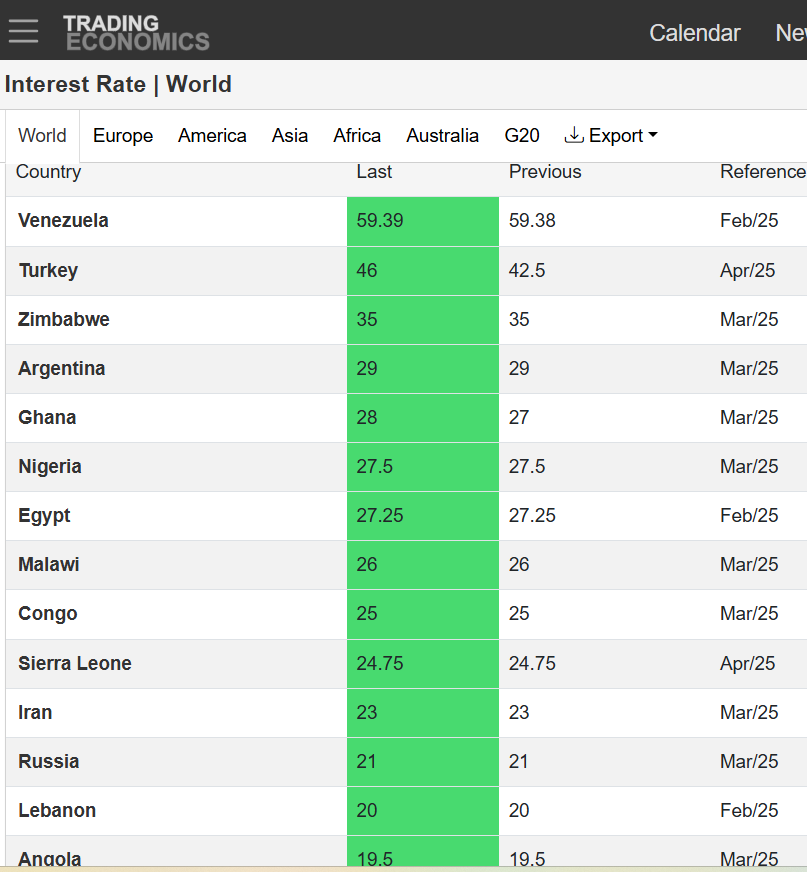 Merkez Bankası, nisan toplantısında politika faizini 350 baz puan artışla yüzde 42,5'ten yüzde 46'ya çıkardı. Peki, dünyada politika faizinin en yüksek olduğu ülkeler kimler? İşte detaylar.. Türkiye Cumhuriyeti Merkez Bankası (TCMB), nisan ayı PPK toplantısının ardından sürpriz bir kararla politika faizini 350 baz puan artırdığını duyurdu. Böylelikle TCMB, politika faizini 13 ay sonra ilk kez artırmış oldu. TCMB, toplantıya ilişkin paylaştığı karar metninde ise temel mal enflasyonunun finansal piyasalardaki gelişmelerin etkisiyle bir miktar yükselebileceğini öngördü. Enflasyon beklentileri ve fiyatlama davranışlarının dezenflasyon süreci açısından risk unsuru olmaya devam ettiğini bildiren TCMB, enflasyonda belirgin ve kalıcı bir bozulma öngörülmesi durumunda para politikası duruşunu sıkılaştıracağını açıkladı. [news_id:769252] TCMB’nin şahin adımının hemen öncesinde ABD Başkanı Donald Trump ise Powell’ın faiz indiriminde geç kaldığını belirterek, "Fed Başkanı Powell, her zaman geç kalıyor ve yanlış yapıyor. Fed uzun zaman önce faizleri indirmeliydi" değerlendirmesinde bulunmuştu. ABD Merkez Bankası (Fed) Başkanı Jerome Powell ise Chicago Ekonomi Kulübü'nde katıldığı etkinlikte, tarifelerin enflasyon üzerindeki etkisinin beklenenden daha fazla olabileceği konusunda uyarıda bulunmuş ve enflasyon beklentilerindeki yukarı yönlü baskı nedeniyle faiz indiriminde aceleci davranmayacaklarının sinyalini vermişti. [news_id:769242] Peki, yüksek enflasyon tedirginliğinin ortasında politika faizinin en yüksek olduğu ülkeler kimler? TradingEconomics sitesine göre Nisan 2025 itibarıyla dünyada politika faizinin en yüksek olduğu ülke yüzde 59,39 ile Venezuela konumunda. Güney Amerika ülkesinin hemen ardından ise yüzde 46 ile Türkiye geliyor. Türkiye’yi ise yüzde 35’lik oranıyla uzun zamandır ekonomik problemlerin merkezinde yer alan Afrika ülkesi Zimbabve izliyor. Öte yandan faiz oranının savaşın ortasındaki Rusya'da yüzde 21, Ukrayna'da ise yüzde 15,5 seviyesinde olduğu görülüyor. TradingEconomics verilerine göre politika faizinin en düşük olduğu ülke ise İsviçre konumunda. Bu alanda İsviçre'nin hemen ardından yüzde 0,5 ile Japonya ve yüzde 0,77 ile Kamboçya geliyor. Kaynak: TradingEconomics