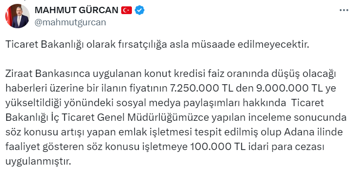 Konut kredisi faizlerindeki düşüşün ardından ilandaki konutun fiyatını 1 milyon 750 bin lira artıran emlak işletmesine Ticaret Bakanlığı'nca 100 bin lira idari para cezası uygulandı. Türkiye Cumhuriyeti Ticaret Bakan Yardımcısı Mahmut Gürcan, sosyal medya hesabından yaptığı açıklamada, Bakanlık olarak fırsatçılığa asla müsaade etmeyeceklerini vurguladı. Gürcan, Ziraat Bankası tarafından uygulanan konut kredisi faiz oranındaki düşüş üzerine bir ilan fiyatının 7 milyon 250 bin liradan 9 milyon liraya yükseltildiği yönündeki sosyal medya paylaşımları hakkında İç Ticaret Genel Müdürlüğü tarafından inceleme yapıldığını belirtti. Söz konusu artışı yapan emlak işletmesinin tespit edildiğini aktaran Gürcan, Adana'da faaliyet gösteren işletmeye 100 bin lira idari para cezası uygulandığını ifade etti. Kaynak: Mahmut Gürcan [news_id:746243]