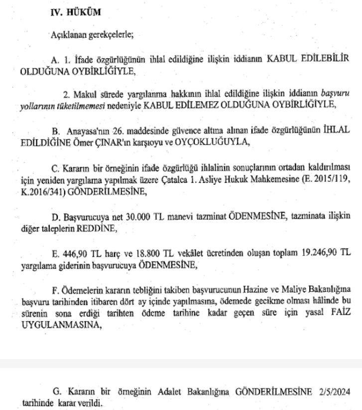 Maaşına yapılan yüzde 5,3 oranındaki zam üzerine yöneticilerine, "Bana verilen zam oranını zarf içinde insan kaynaklarına iade ediyorum. Bu oranı kim ya da kimler belirlediyse aralarında paylaşsınlar" şeklinde e-posta gönderen işçinin tazminatsız şekilde işten çıkarılması sonrası Anayasa Mahkemesi (AYM), işçinin ifade özgürlüğünün ihlal edildiğine hükmetti. Resmi Gazete'de yayımlanan karara göre, maaşına yapılan yıllık yüzde 5,3 oranındaki zammı beğenmeyen Serap Aslan A. iş yerindeki yönetici ve işçilere, "Merhabalar, bana verilen zam oranını zarf içinde insan kaynaklarına iade ediyorum. Bu oranı kim ya da kimler belirlediyse aralarında paylaşsınlar, bilgilerinize" şeklinde e-posta yolladı. Bu ifadeler nedeniyle iş akdi feshedilen Serap Aslan A. iş akdinin haksız feshedildiğini belirterek, kıdem ve ihbar tazminatının ödenmesine karar verilmesi talebiyle Çatalca 1. Asliye Hukuk Mahkemesine dava açtı. E-postanın, işverenin veya onu temsile yetkili olan ve zam oranını belirleyen işveren vekillerinin onur ve saygınlığına zarar verebilecek örtülü hakaret niteliği taşıdığına hükmeden mahkeme, feshin haklı olduğu gerekçesiyle kıdem ve ihbar tazminatı talebini reddetti. Serap Aslan A, yerel mahkeme kararının Yargıtay 9. Hukuk Dairesince onanması üzerine, AYM'ye bireysel başvuruda bulundu. Başvurucuyu haklı bulan Yüksek Mahkeme, Anayasa'nın 26. maddesinde güvence altına alınan ifade özgürlüğünün ihlal edildiğine karar vererek, başvurucuya, 30 bin lira manevi tazminat ödenmesine hükmetti. Kararın bir örneği, ifade özgürlüğünün ihlali sonuçlarının ortadan kaldırılması için yeniden yargılama yapılmak üzere Çatalca 1. Asliye Hukuk Mahkemesine gönderildi. "Adil bir denge kurulmadı" Kararın gerekçesinde, başvurucunun, maaş zam oranından duyduğu memnuniyetsizliği e-posta yoluyla işveren veya işveren adına yetkili temsilcilerine bildirdiği belirtilerek, yerel mahkemenin, bu memnuniyetsizliğin uygun bir üslupla ifade edilmesi gerektiğine işaret ettiği kaydedildi. İfade özgürlüğünün demokratik bir toplumun zorunlu temellerinden biri ve toplumun ilerlemesi, her bireyin gelişmesi için gerekli temel şartlardan olduğuna vurgu yapılan kararda, devletin bu özgürlüğe en yüksek güvenceyi sağlaması gerektiği aktarıldı. E-posta içeriğinden, başvurucunun herhangi bir somutlaştırma yapmadan ve isnatta bulunmadan maaş zammını düşük bulmasından duyduğu rahatsızlığı, ilgililerin dikkatine sunmaya çalıştığının anlaşıldığı bildirilen kararda, şu ifadeler yer aldı: "Başvurucunun iş akdinin haksız olarak feshedildiğinden hareketle açtığı alacak davasını reddeden mahkemenin, başvurucunun ifade özgürlüğü ile işveren veya işveren vekillerinin şeref ve itibar hakları arasında adil bir denge kurabildiğinden bahsetmek mümkün olmayacaktır. Dolayısıyla mahkemenin başvurucunun ifade özgürlüğü ile iş yerinin disiplini, düzeni ve çalışma barışının sağlanması amacı arasında adil bir denge kurulmasına yönelik ilgili ve yeterli bir gerekçe sunmadığı sonucuna ulaşılmıştır." Kaynak: Resmi Gazete