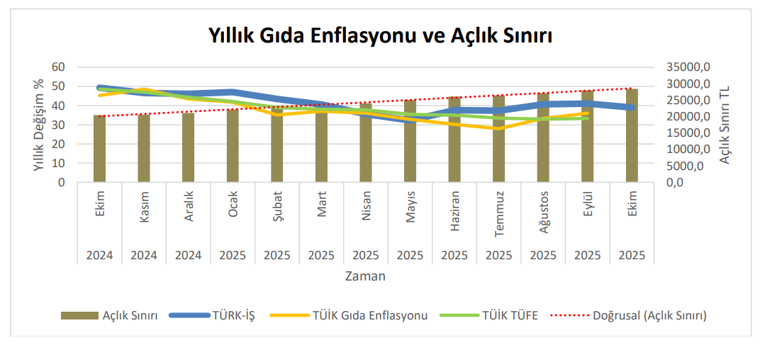 TÜRK-İŞ’in araştırmasına göre ekim ayında açlık sınırı 28 bin 412 liraya, yoksulluk sınırı ise 92 bin 547 liraya yükseldi. TÜRK-İŞ, açlık ve yoksulluk sınırı araştırmasının ekim ayı sonuçlarını açıkladı. İlgili sonuçlara göre Ankara’da yaşayan dört kişilik bir ailenin sağlıklı, dengeli ve yeterli beslenebilmesi için yapması gereken aylık gıda harcaması tutarı (açlık sınırı) 28.412 TL’ye yükseldi. Gıda harcaması ile giyim, konut (kira, elektrik, su, yakıt), ulaşım, eğitim, sağlık ve benzeri ihtiyaçlar için yapılması zorunlu diğer aylık harcamalarının toplam tutarı ise (yoksulluk sınırı) 92.547 TL’ye çıktı. Bekâr bir çalışanın yaşama maliyeti de aylık 36.984 TL’ye ulaştı. Kaynak: TÜRK-İŞ Gıda enflasyonu TÜRK-İŞ’ in verilerine göre “gıda enflasyonu” verilerindeki değişim ise Ekim 2025’te şöyle oldu: 📌 Ankara’da yaşayan dört kişilik bir ailenin “gıda için” yapması gereken asgari harcama tutarındaki artış bir önceki aya göre yüzde 1,58 oranında gerçekleşti. 📌 On iki aylık değişim oranı yüzde 39,06 oldu. 📌 Yıllık ortalama artış ise yüzde 40,22 olarak gerçekleşti. 📌 Yılın ilk on ayındaki değişim oranı yüzde 34,76 olarak kayıtlara geçti. [news_id:790147]