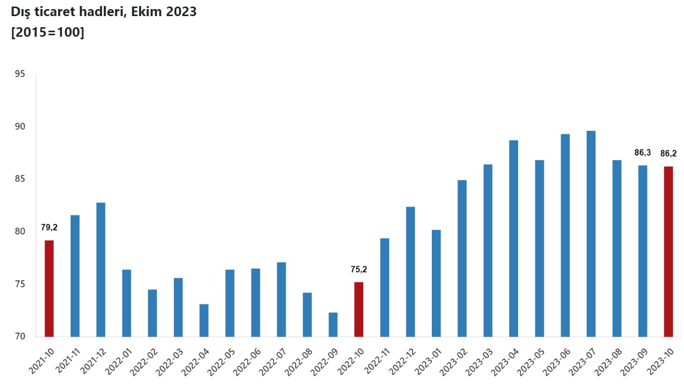 TÜİK verilerine göre dış ticaret haddi, ekimde bir önceki yılın aynı dönemine göre artarken bir önceki aya göre ise düşüş kaydeti. Türkiye İstatistik Kurumu (TÜİK), Ekim 2023 dönemine ilişkin Dış Ticaret Endeksleri’ni açıkladı. TÜİK tarafından açıklanan verilere göre ihracat birim değer endeksinin ithalat birim değer endeksine bölünmesiyle hesaplanan dış ticaret haddi, ekimde 86,2 oldu. Endeks bir önceki yılın aynı dönemine göre yükselirken eylül ayına göre düştü. Eylülde dış ticaret haddi 86,3 olarak açıklanmıştı. Kaynak: TÜİK İharacat endeksleri İhracat birim değer endeksi ekim ayında bir önceki yılın aynı ayına göre yüzde 0,1 arttı. Endeks bir önceki yılın aynı ayına göre gıda, içecek ve tütünde yüzde 0,1 azaldı, ham maddelerde (yakıt hariç) yüzde 6,6 azaldı, yakıtlarda yüzde 19,9 azaldı, imalat sanayinde (gıda, içecek, tütün hariç) yüzde 1,9 arttı. İhracat miktar endeksi isebir önceki yılın aynı ayına göre yüzde 7,2 arttı. Endeks bir önceki yılın aynı ayına göre gıda, içecek ve tütünde yüzde 19,0 arttı, ham maddelerde (yakıt hariç) yüzde 3,9 azaldı, yakıtlarda yüzde 46,0 arttı, imalat sanayinde (gıda, içecek, tütün hariç) yüzde 0,6 arttı. Mevsim ve takvim etkilerinden arındırılmış seriye göre ihracat miktar endeksi; 2023 Eylül ayında 159,2 iken 2023 Ekim ayında yüzde 4,1 oranında azalarak 152,6 oldu. Takvim etkilerinden arındırılmış seriye göre ise ihracat miktar endeksi; 2022 yılı Ekim ayında 158,8 iken 2023 yılı Ekim ayında yüzde 3,0 oranında artarak 163,6 oldu.