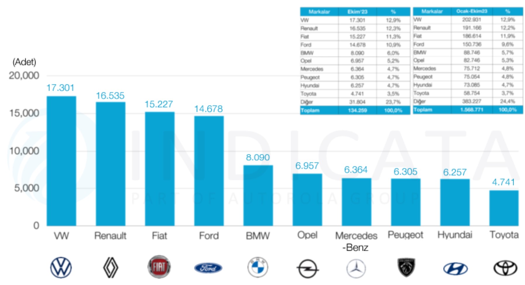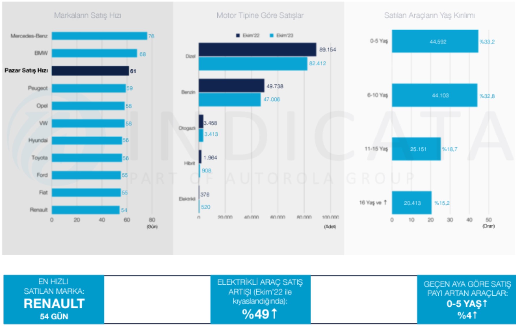 Türkiye'de ikinci el araç pazarında satış sayısı ekimde bir önceki aya göre yüzde 5 azalırken, araç perakende fiyatları ise ortalama yüzde 1,54 düştü. Peki, ekimde en çok hangi araçlar satıldı? İşte detaylar.. Indicata'nın ikinci el çevrim içi pazar raporundan derlenen verilere göre ekim ayında yılın en yüksek ilan adedine ulaşıldı. Eylül ayına göre 10 bin 9, geçen senenin ekim ayına göre 29 bin 492 adet daha fazla kurumsal ilan yayımlanırken, ekimde yayımlanan 388 bin 283 adet kurumsal ilanın yüzde 35'i olan 134 bin 259 adedin satıldığı gözlendi. Bu kapsamda satışlarda, eylül ayına göre yüzde 5, geçen senenin ekim ayına göre yüzde 7 düşüş gerçekleşti. Ancak bu yılın ocak-ekim döneminde geçen yılın aynı dönemine göre satış adetlerinde yüzde 10 artış kaydedildi. İkinci el çevrim içi binek ve hafif ticari araç pazarında en çok satışı yapılan ilk 32 markanın 253 modeline ait 139 bin 335 adet ilanın fiyat değişimleri incelenerek yapılan analize göre ekimde bu pazarda perakende fiyatlar ise bir önceki aya göre yüzde 1,54 düştü. Geçen ay da araç fiyatları aylık bazda yüzde 2,59 gerilemişti. En çok tercih edilen ilk 10 marka İkinci el otomotiv pazarında ekim ayında en çok tercih edilen markalar sırasıyla WW (%12,9), Renault (%12,3) ve Fiat (11,3) oldu. Kaynak: Indicata Model bazlı olarak incelendiğinde ise VW Passat liderlik koltuğuna otururken, Fiat Egea ve Renault Megane ilk üçe giren diğer araç modelleri oldu. Kaynak: Indicata İkinci elde satış süresi en az ve en çok olan araç markaları Geçen ay satılan binek araçların yüzde 40'ını C segmenti araçlar oluşturdu. Ekim 2022'ye göre S ve SUV segment araçların satışlarının toplam binek araç satışı içindeki payı arttı. Ekim ayında eylüle göre ise D SUV, S ve C SUV segmentlerinin satış payında artış oldu. İkinci elde satış sürelerinin ortalaması 61 gün olurken, satış hızına göre en geç satılan marka 76 gün ile Mercedes-Benz, en hızlı satılan marka ise 54 gün ile Renault oldu. Kaynak: Indicata Bireysel ilanlar bulunmuyor Rakamlar içerisinde bireysel araç ilanlarına ait veriler bulunmuyor. Online platformda ikinci el ticareti yapan kurumlar, iki sebeple satışa sundukları araçların ilanlarını geri çekiyor. Birincisi, değişen pazar koşullarına göre ilandaki araçların fiyatını revize ederek ilanı yeniden yayınlıyor. Söz konusu ilanların yeniden ne zaman yayınlandığı da Indicata tarafından takip ediliyor. İkinci olarak, ticaret yapan kurum, aracını sattığı için ilandan çekiyor ve yeniden satışa sunacağı bir aracının ilanını yayınlıyor. Bu ikinci grup araç ilanları, yani ilandan tamamen kaldırılan araçlar "satış" olarak kabul ediliyor. [news_id:714011]