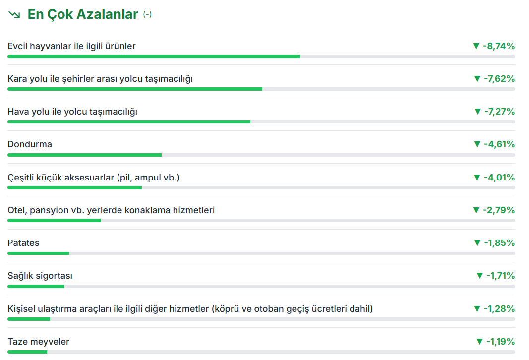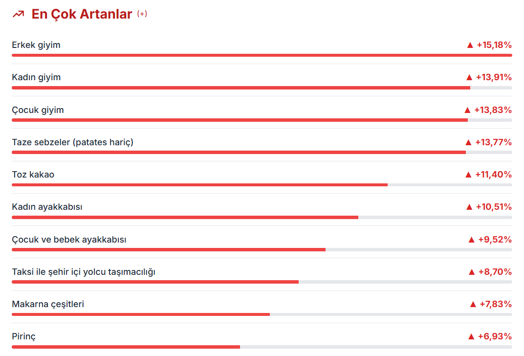 Tüketici fiyatları bazında ekimde en yüksek fiyat artışı yüzde 15,18 ile erkek giyimde gerçekleşirken en çok ucuzlayan ürün yüzde 8,74 ile evcil hayvanlar ile ilgili ürünler olarak belirlendi. Türkiye İstatistik Kurumu (TÜİK) verilerine göre, erkek giyimdeki fiyat artışını 13,91 ile kadın giyim ve 13,83 ile çocuk giyim izledi. Ekimde fiyatı en çok artış gösteren diğer ürünler arasında, yüzde 13,77 ile taze sebzeler (patates hariç), yüzde 11,4 ile toz kakao, yüzde 10,51 ile kadın ayakkabısı ve yüzde 9,52 ile çocuk ve bebek ayakkabısı yer aldı. En çok evcil hayvanlar ile ilgili ürünler ucuzladı Geçen ay en fazla fiyat düşüşü, yüzde 8,74 ile evcil hayvanlar ile ilgili ürünlerde gerçekleşti. Bunu yüzde 7,62 ile kara yoluyla şehirler arası yolcu taşımacılığı, yüzde 7,27 ile hava yoluyla yolcu taşımacılığı, yüzde 4,61 ile dondurma, yüzde 4,01 ile çeşitli küçük aksesuarlar (pil, ampul vb.) takip etti. TÜİK'in tüketici fiyatları endeksine göre, ekimde aylık bazda fiyatları en fazla artan ürünler ile bunların bir önceki aya göre değişim oranları şöyle: Ekimde fiyatı en fazla düşen seçilmiş maddeler ile bir önceki aya göre değişim oranları ise şöyle: