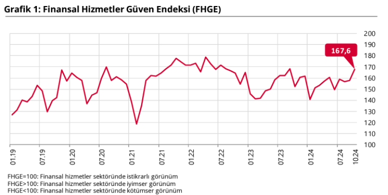 Ekim ayında Finansal Hizmetler Güven Endeksi, bir önceki aya göre 9,8 puan artarak 167,6 seviyesinde gerçekleşti. TCMB’den yapılan açıklamaya göre, endeksi oluşturan anket sorularına ait yayılma endeksleri incelendiğinde, son üç aydaki iş durumu ile hizmetlere olan talebin FHGE’yi artış yönünde etkilediği, gelecek üç aydaki hizmetlere olan talep beklentisinin ise FHGE’yi bir miktar azalış yönünde etkilediği görüldü. Kaynak: Finansal Hizmetlere Güven Endeksi - TCMB Açıklamada ise konuyla ilgili şunlar aktarıldı: “İş durumu ve hizmetlere olan talebe ilişkin değerlendirmelere göre, son üç ayda iş durumunda iyileşme ve hizmetlere olan talepte artış olduğu yönündeki değerlendirmelerin bir önceki aya kıyasla güçlendiği gözlenmektedir. Gelecek üç ayda hizmetlere olan talepte artış olacağı yönündeki beklentilerin ise bir miktar zayıfladığı görülmektedir. İstihdama ilişkin değerlendirmelere göre, son üç ayda istihdamda artış olduğunu bildirenler lehine olan seyrin zayıfladığı, gelecek üç ayda istihdamda artış olacağını bekleyenler lehine olan seyrin ise azalış olacağını bekleyenler lehine döndüğü gözlenmektedir. Son üç aydaki kârlılığa ilişkin değerlendirmelere göre, bir önceki dönemde azalış bildirenler lehine olan seyrin artış bildirenler lehine döndüğü görülmektedir. Gelecek üç aydaki kârlılıkta artış olacağını bekleyenler lehine olan seyrin ise güçlendiği gözlenmektedir. 2024 yılı Ekim ayında, NACE Rev.2 sektör sınıflamasına göre “Finans ve Sigorta Faaliyetleri” sektöründe güven endeksleri alt sektörler itibarıyla değerlendirildiğinde, “64-Finansal Hizmet Faaliyetleri (sigorta ve emeklilik fonları hariç)” ve “65-Sigorta, Reasürans ve Emeklilik Fonları (zorunlu sosyal güvenlik hizmetleri hariç)“ sektörlerinde bir önceki aya göre sırasıyla 10,7, ve 0,4 puanlık artış, “66-Finansal Hizmetler ile Sigorta Faaliyetleri için Yardımcı Faaliyetler” sektöründe ise bir önceki aya göre 24,7 puanlık azalış olduğu gözlenmektedir. “