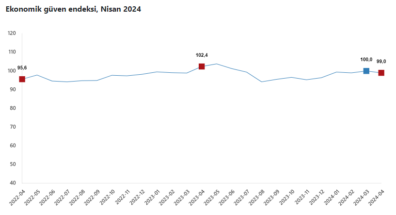 TÜİK'e göre ekonomik güven endeksi nisan ayında yüzde 1 azalarak 99 değerini aldı. Türkiye İstatistik Kurumu 2024 Nisan ayına ilişkin Ekonomik güven endeksini açıkladı. Ekonomik güven endeksi mart ayında 100 iken, nisan ayında %1 oranında azalarak 99,0 değerini aldı. Bir önceki aya göre nisan ayında tüketici güven endeksi %1,4 oranında artarak 80,5 değerini, reel kesim (imalat sanayi) güven endeksi aynı düzeyde kalarak 103,5 değerini, hizmet sektörü güven endeksi %2,8 oranında azalarak 117,1 değerini, perakende ticaret sektörü güven endeksi %1,9 oranında artarak 115,5 değerini, inşaat sektörü güven endeksi aynı düzeyde kalarak 88,6 değerini aldı. Kaynak: TÜİK Ekonomik Güven Endeksi nedir? Ekonomik güven endeksi, tüketici ve üreticilerin genel ekonomik duruma ilişkin değerlendirme, beklenti ve eğilimlerini özetleyen bir bileşik endeks. Endeks, tüketici güven endeksi, mevsim etkilerinden arındırılmış reel kesim, hizmet, perakende ticaret ve inşaat sektörleri güven endekslerinin alt endekslerinin ağırlıklandırılarak birleştirilmesinden oluşuyor. Ekonomik güven endeksinin hesaplamasında kullanılan alt endeksler her ayın ilk iki haftasında derlenen veriler kullanılarak hesaplanıyor. Ekonomik güven endeksinin 100'den büyük olması genel ekonomik duruma ilişkin iyimserliği, 100'den küçük olması ise genel ekonomik duruma ilişkin kötümserliği gösteriyor.
