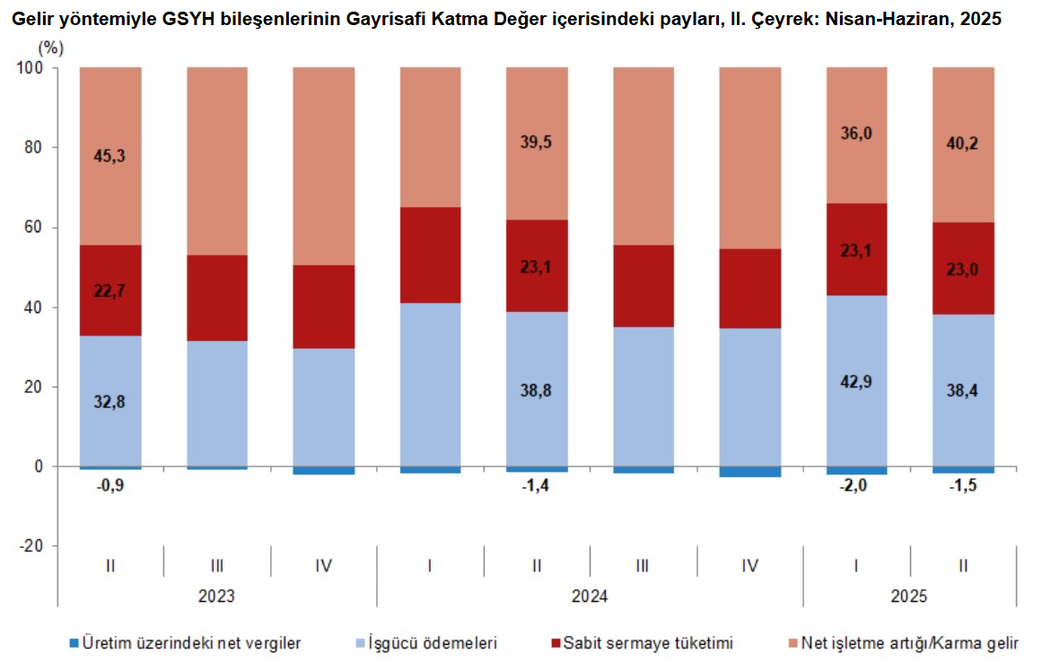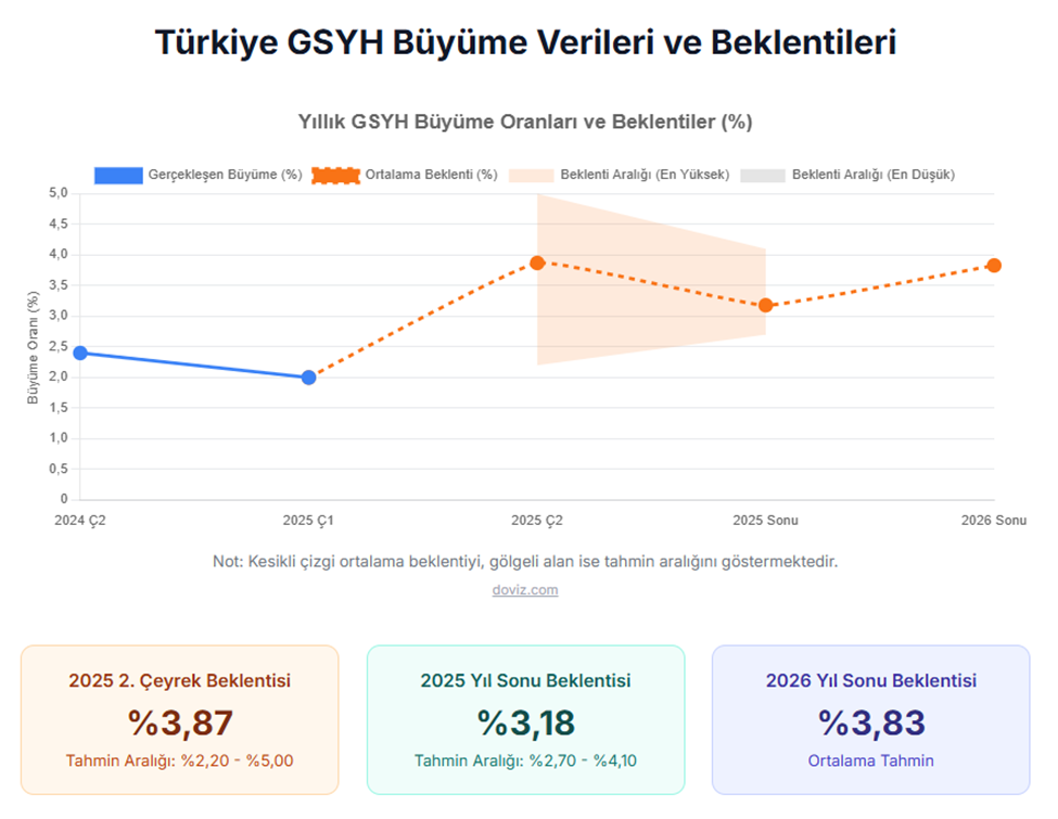 Türkiye İstatistik Kurumu (TÜİK), 2025 yılının ikinci çeyreğine ilişkin Gayrisafi Yurt içi Hasıla verilerini açıkladı. TÜİK’in açıkladığı verilere göre ekonomi ikinci çeyrekte yıllık bazda %4,8 büyüme kaydetti. AA Finans'ın anket sonuçlarına göre ekonomistler, bu yılın ikinci çeyreğinde Türkiye ekonomisinin %3,87 büyüdüğünü tahmin etmişti. Ankete katılan ekonomistlerin beklentileri %2,20 ile %5 aralığında yer almıştı. Türkiye ekonomisi yılın ilk çeyreklik döneminde ise yüzde 2 büyüme gerçekleştirmişti. GSYH'yi oluşturan faaliyetler incelendiğinde; 2025 yılı ikinci çeyreğinde bir önceki yıla göre zincirlenmiş hacim endeksi olarak; inşaat sektörü toplam katma değeri %10,9, bilgi ve iletişim faaliyetleri %7,1, sanayi sektörü %6,1, ticaret, ulaştırma, konaklama ve yiyecek hizmetleri %5,6, mesleki, idari ve destek hizmet faaliyetleri %5,4, ürün üzerindeki vergiler eksi sübvansiyonlar %3,0, finans ve sigorta faaliyetleri %2,6, gayrimenkul faaliyetleri %2,6 ve diğer hizmet faaliyetleri %2,1 arttı. Tarım sektörü %3,5, kamu yönetimi, eğitim, insan sağlığı ve sosyal hizmet faaliyetleri ise %1,2 azaldı. Mevsim ve takvim etkilerinden arındırılmış GSYH zincirlenmiş hacim endeksi, bir önceki çeyreğe göre %1,6 arttı. Takvim etkisinden arındırılmış GSYH zincirlenmiş hacim endeksi, 2025 yılı ikinci çeyreğinde bir önceki yılın aynı çeyreğine göre %4,6 arttı. Üretim yöntemiyle Gayrisafi Yurt İçi Hasıla tahmini, 2025 yılının ikinci çeyreğinde cari fiyatlarla bir önceki yılın aynı çeyreğine göre %43,7 artarak 14 trilyon 578 milyar 556 milyon TL oldu. GSYH'nin ikinci çeyrek değeri cari fiyatlarla ABD doları bazında 377 milyar 622 milyon olarak gerçekleşti. Yerleşik hanehalklarının nihai tüketim harcamaları 2025 yılının ikinci çeyreğinde bir önceki yılın aynı çeyreğine göre zincirlenmiş hacim endeksi olarak %5,1 arttı. Devletin nihai tüketim harcamaları %5,2 azalırken gayrisafi sabit sermaye oluşumu ise %8,8 arttı. Mal ve hizmet ihracatı, 2025 yılının ikinci çeyreğinde bir önceki yılın aynı çeyreğine göre zincirlenmiş hacim endeksi olarak %1,7, ithalatı ise %8,8 arttı. Kaynak: TÜİK İşgücü ödemeleri, 2025 yılının ikinci çeyreğinde bir önceki yılın aynı çeyreğine göre %42,0 arttı. Net işletme artığı/karma gelir %46,3 arttı. İşgücü ödemelerinin cari fiyatlarla Gayrisafi Katma Değer içerisindeki payı geçen yılın ikinci çeyreğinde %38,8 iken, bu oran 2025 yılında %38,4 oldu. Net işletme artığı/karma gelirin payı ise %39,5 iken %40,2 oldu. Kaynak: TÜİK