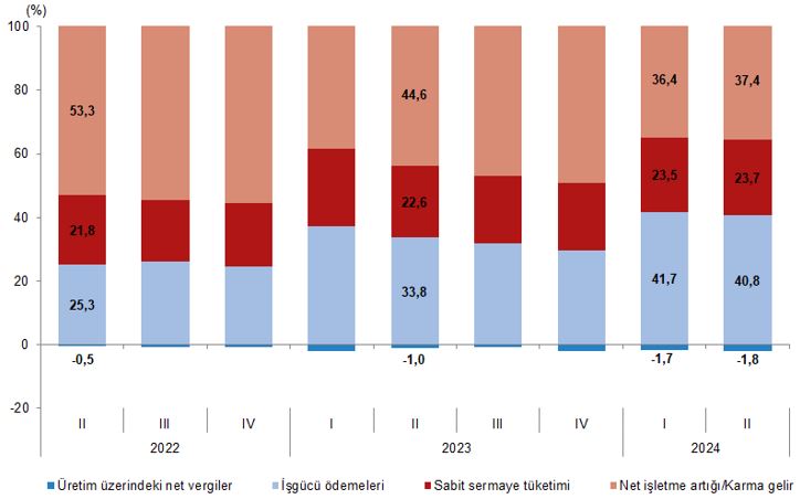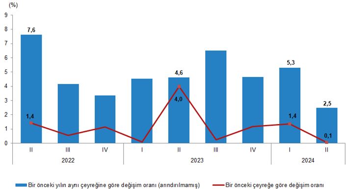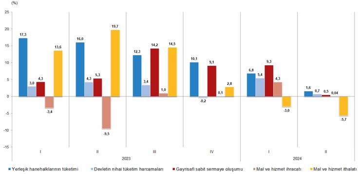 Türkiye İstatistik Kurumu (TÜİK), 2024 yılının ikinci çeyreğine ilişkin Gayrisafi Yurt içi Hasıla verilerini açıkladı. TÜİK’in açıkladığı verilere göre ekonomi ikinci çeyrekte yıllık bazda %2,5 büyüme kaydetti. Bu döneme ilişkin piyasaların genel beklentisi ise %2,8 büyüme gerçekleşmesi yönündeydi. Kaynak: TÜİK AA Finans'ın anket sonuçlarına göre ise ekonomistler bu yılın ikinci çeyreğinde Türkiye ekonomisinin yıllık bazda %3 büyüdüğünü tahmin etmiş, ankete katılan ekonomistlerin beklentileri de %2,6 ile %3,5 aralığında yer almıştı. Türkiye ekonomisi, geçen yılın aynı çeyreğinde yüzde 3,9, 2024 yılının ilk çeyreğinde ise yüzde 5,7 büyüme kaydetmişti. İkinci çeyreğe ilişkin GSYH'yi oluşturan faaliyetler incelendiğinde; 2024 yılı ikinci çeyreğinde bir önceki yıla göre zincirlenmiş hacim endeksi olarak; diğer hizmet faaliyetleri %7,4, inşaat %6,5, tarım sektörü ile gayrimenkul faaliyetleri %3,7, bilgi ve iletişim faaliyetleri ile finans ve sigorta faaliyetleri %3,4, kamu yönetimi, eğitim, insan sağlığı ve sosyal hizmet faaliyetleri %3,2, hizmetler %2,9, mesleki, idari ve destek hizmet faaliyetleri %0,6 arttı. Sanayi sektörü ise %1,8 azaldı. Mevsim ve takvim etkilerinden arındırılmış GSYH zincirlenmiş hacim endeksi, bir önceki çeyreğe göre %0,1 arttı. Takvim etkisinden arındırılmış GSYH zincirlenmiş hacim endeksi, 2024 yılı ikinci çeyreğinde bir önceki yılın aynı çeyreğine göre %2,8 arttı. Üretim yöntemiyle Gayrisafi Yurt İçi Hasıla tahmini, 2024 yılının ikinci çeyreğinde cari fiyatlarla bir önceki yılın aynı çeyreğine göre %78,6 artarak 9 trilyon 949 milyar 792 milyon TL oldu. GSYH'nin ikinci çeyrek değeri cari fiyatlarla ABD doları bazında 308 milyar 158 milyon olarak gerçekleşti. Hanehalkı nihai tüketim harcamaları %1,6 arttı Yerleşik hanehalklarının nihai tüketim harcamaları 2024 yılının ikinci çeyreğinde bir önceki yılın aynı çeyreğine göre zincirlenmiş hacim endeksi olarak %1,6 arttı. Devletin nihai tüketim harcamaları %0,7, gayrisafi sabit sermaye oluşumu ise %0,5 arttı. Mal ve hizmet ihracatı, 2024 yılının ikinci çeyreğinde bir önceki yılın aynı çeyreğine göre zincirlenmiş hacim endeksi olarak %0,04 artarken ithalatı %5,7 azaldı. Kaynak: TÜİK İşgücü ödemeleri %112 arttı İşgücü ödemeleri, 2024 yılının ikinci çeyreğinde bir önceki yılın aynı çeyreğine göre %112,4 arttı. Net işletme artığı/karma gelir %47,7 arttı. İşgücü ödemelerinin cari fiyatlarla Gayrisafi Katma Değer içerisindeki payı geçen yılın ikinci çeyreğinde %33,8 iken, bu oran 2024 yılında %40,8 oldu. Net işletme artığı/karma gelirin payı ise %44,6 iken %37,4 oldu. Kaynak: TÜİK
